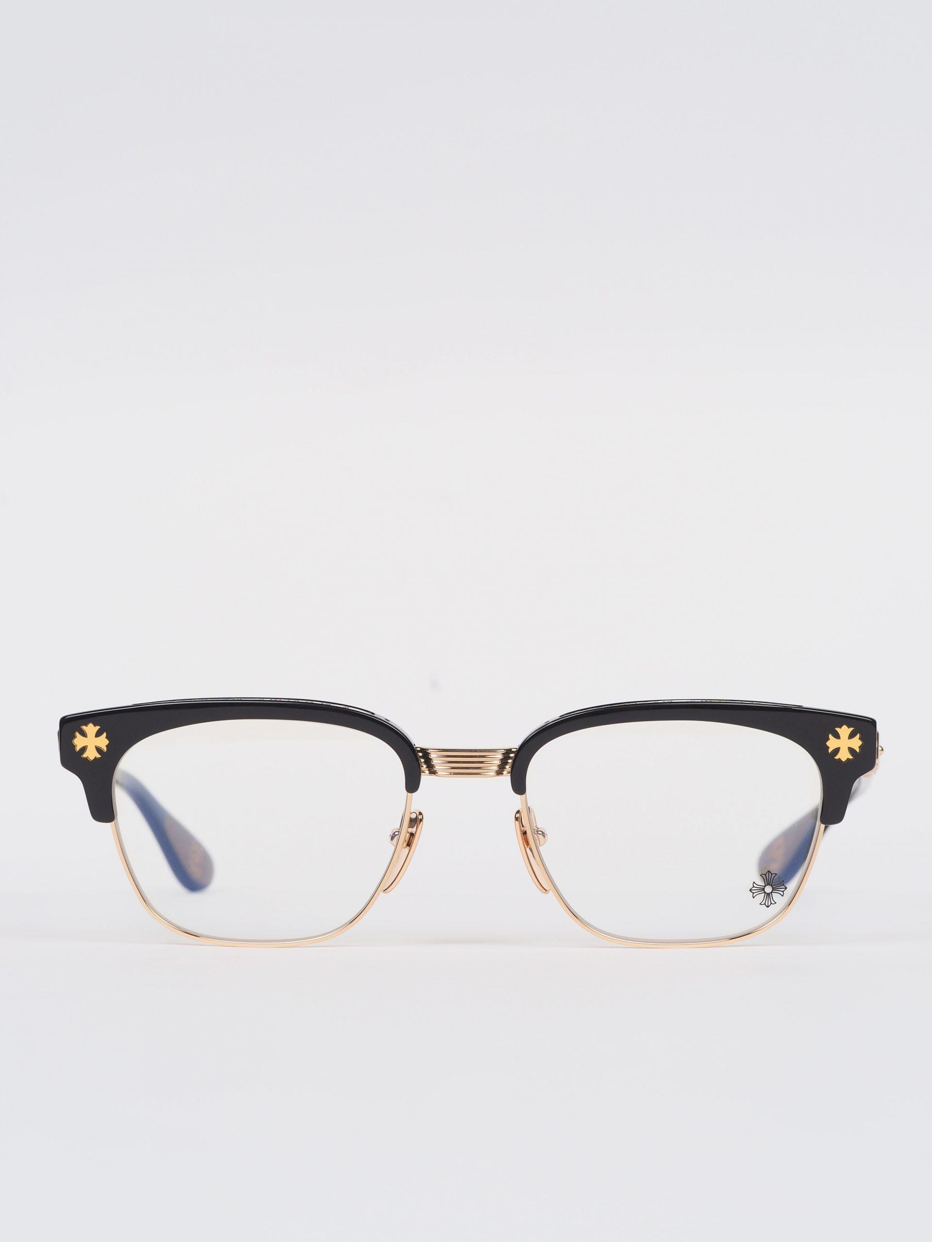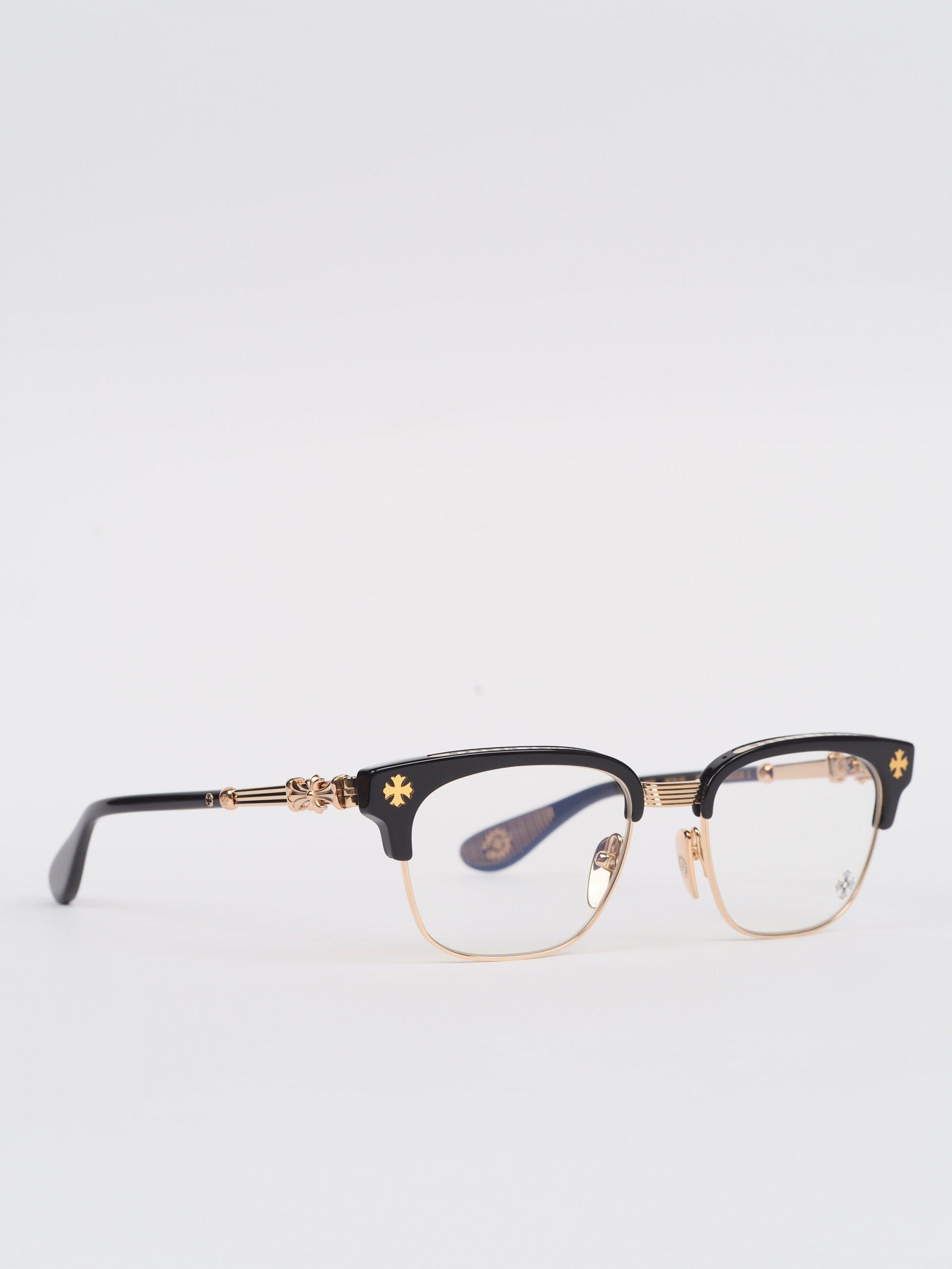 The Chrome Hearts glasses BONENNOISSEUR II – BLACKGOLD PLATED epitomize luxury. With their intricate jeweled detailing and striking black/gold plated frames, they make a statement of opulence and refinement.