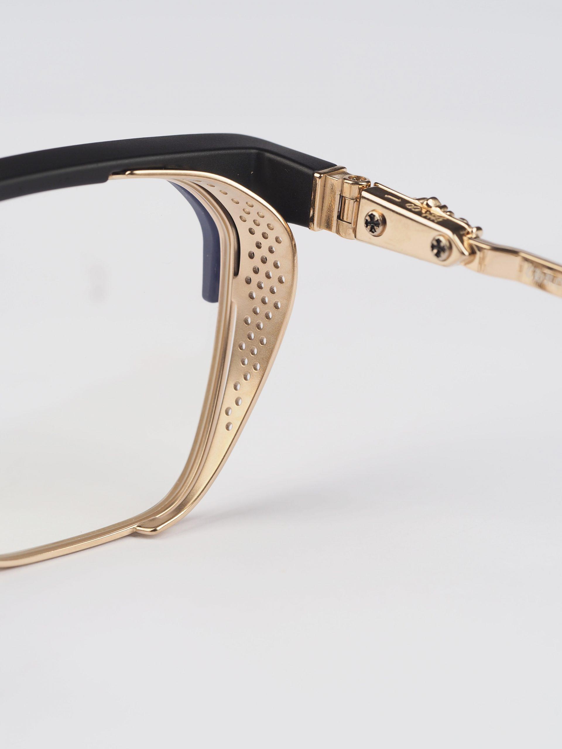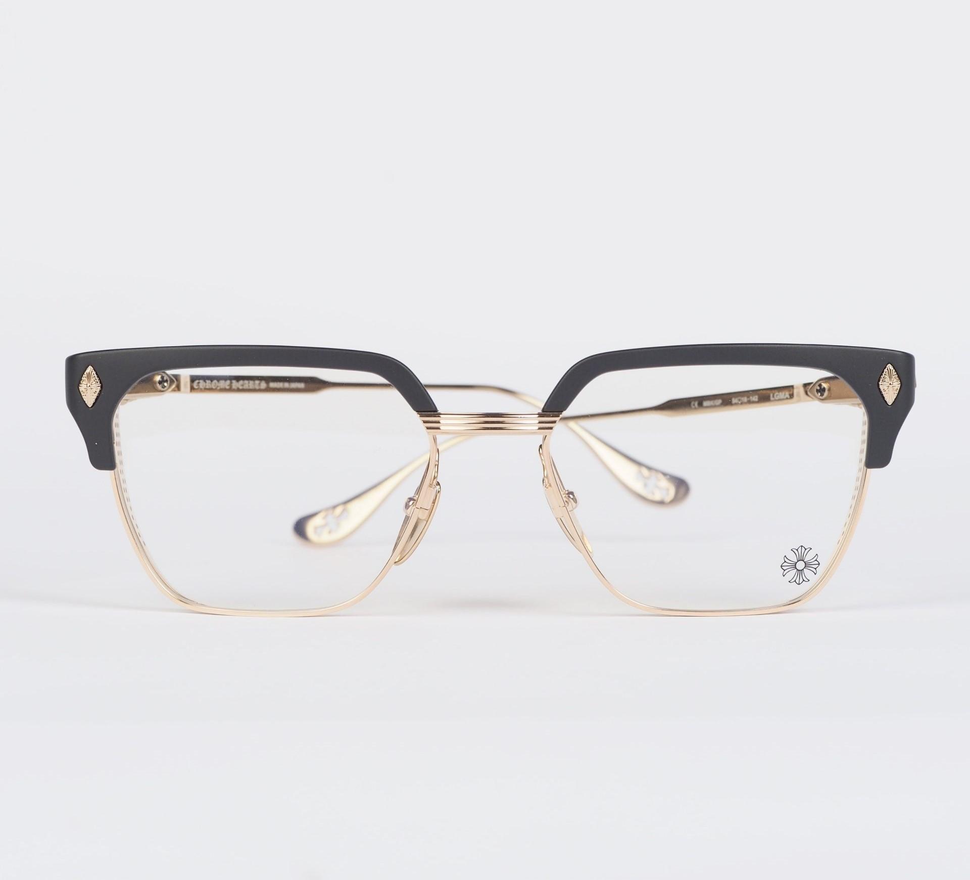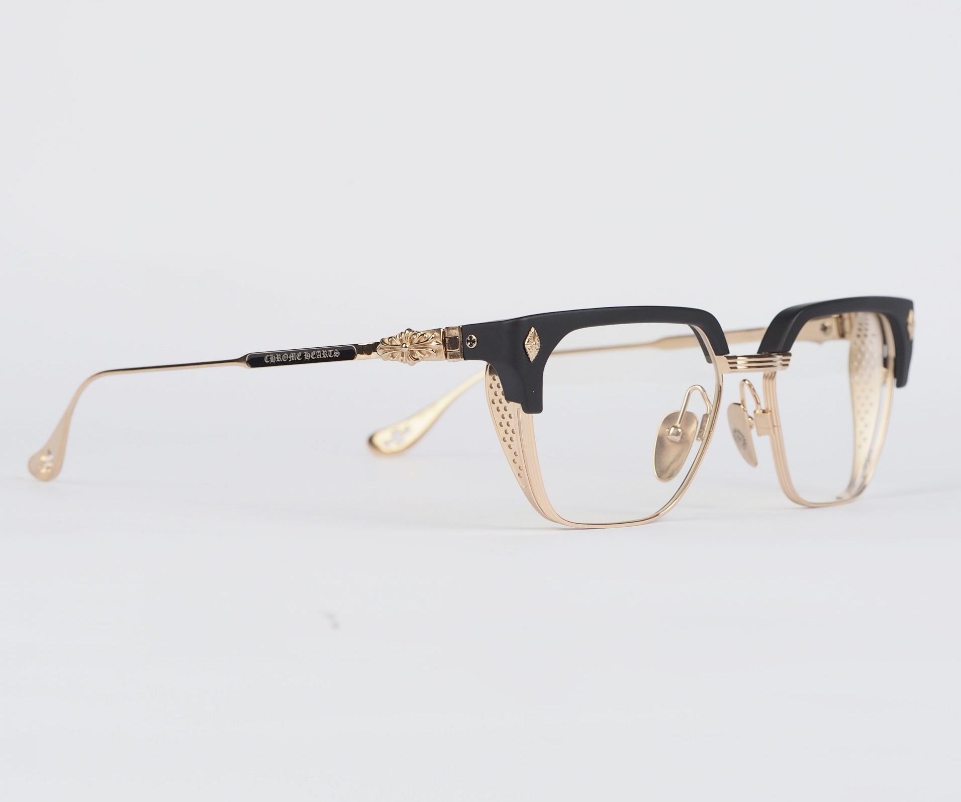 Chrome Hearts glasses LGMA – MATTE BLACK/GOLD PLATED epitomize luxury. With matte black frames and gold-plated accents, they offer a sophisticated accessory for discerning individuals.