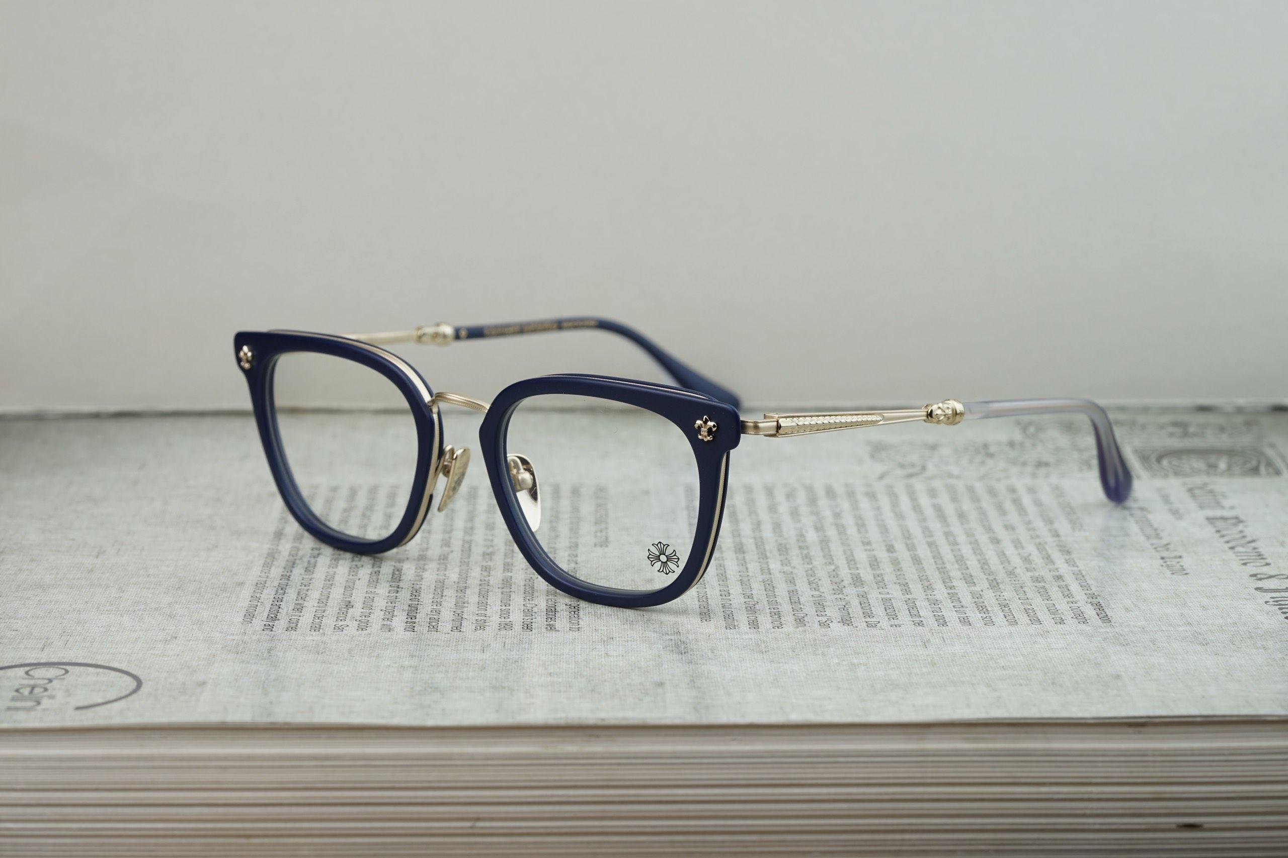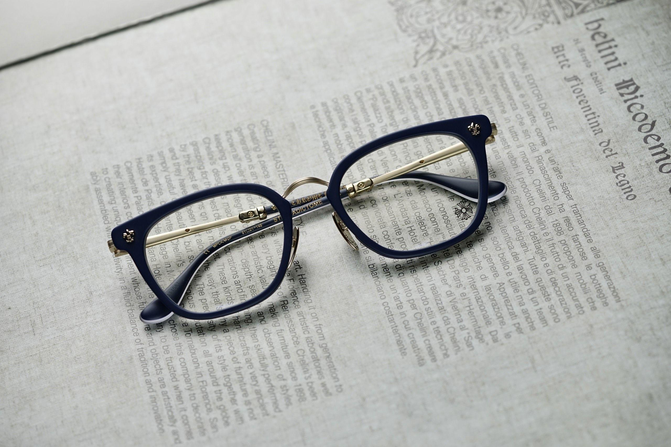 The Chrome Hearts Glasses STRAPADICTOME – Blue GOLD PLATED exudes urban sophistication, featuring matte P.COOK frames complemented by elegant matte gold-plated accents, making a stylish statement.