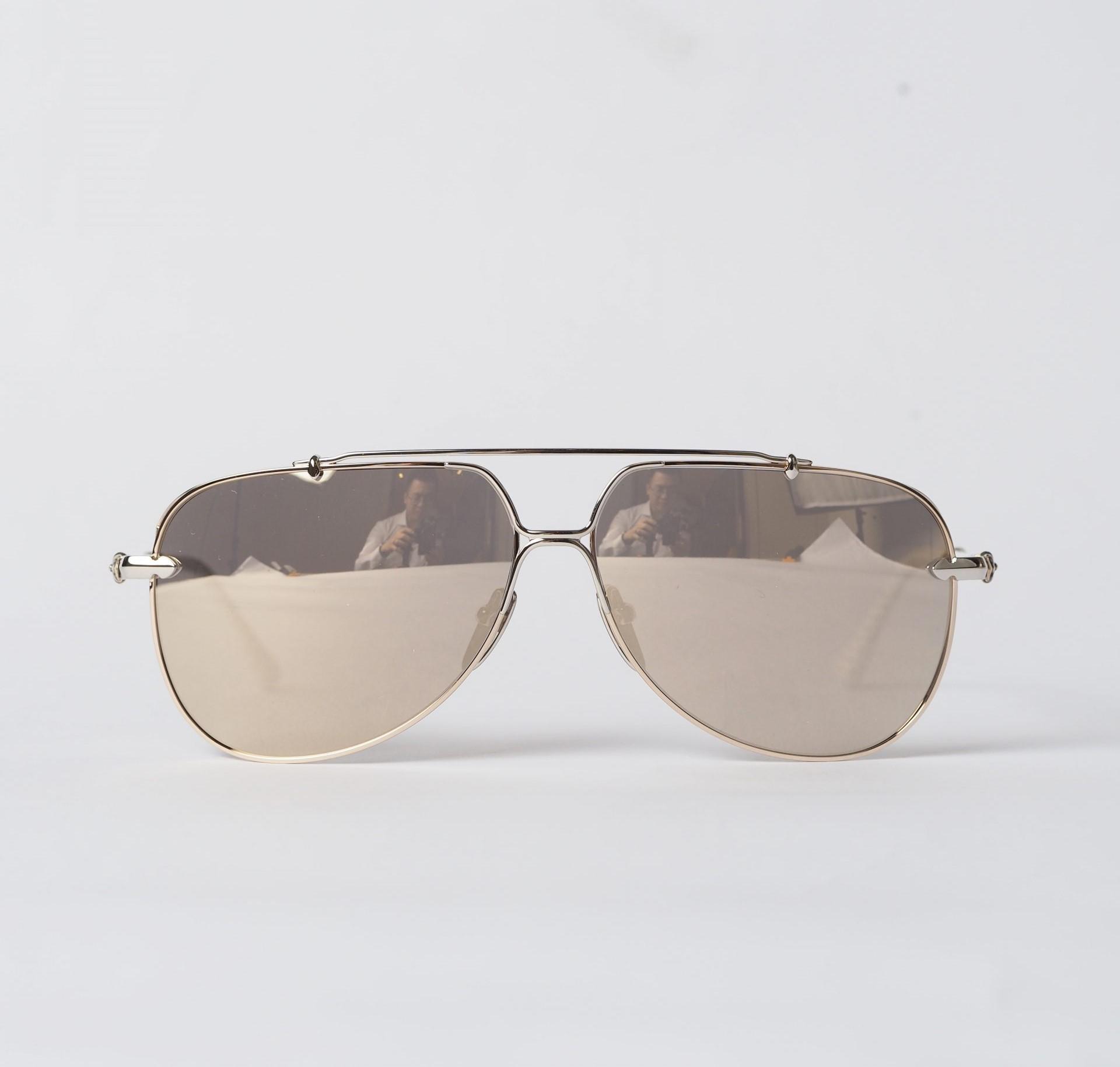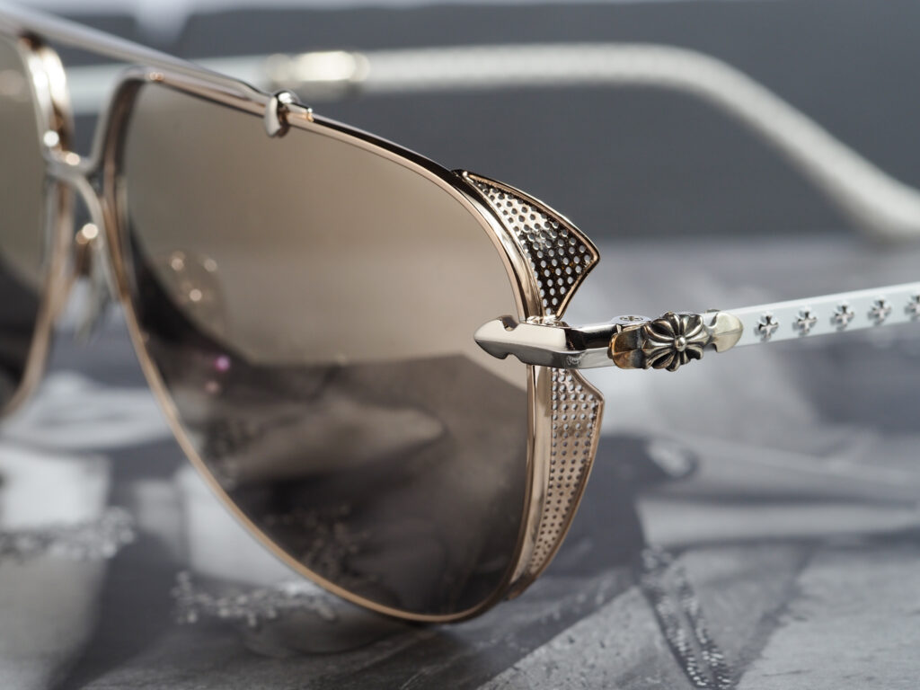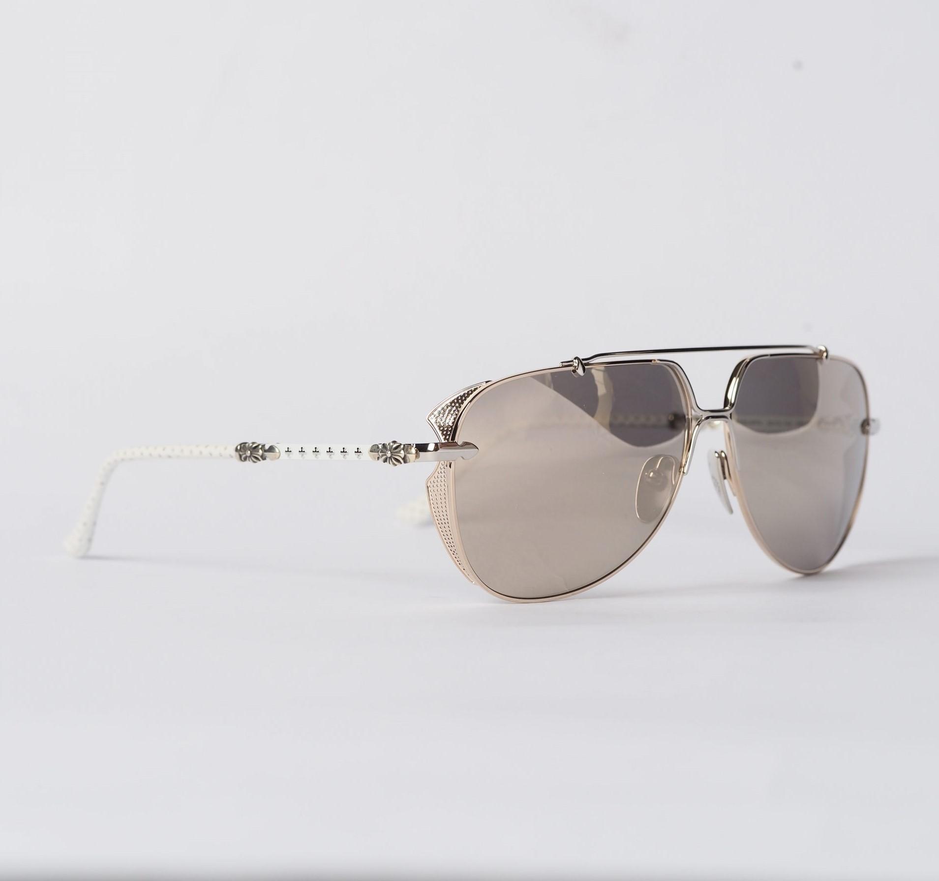 Chrome Hearts Sunglasses GRITT – GOLD PLATED/SHINY SILVER/WHITE PERFORATED LEATHER exude luxury. Featuring gold-plated and shiny silver accents with white perforated leather, they offer a sophisticated and stylish accessory.