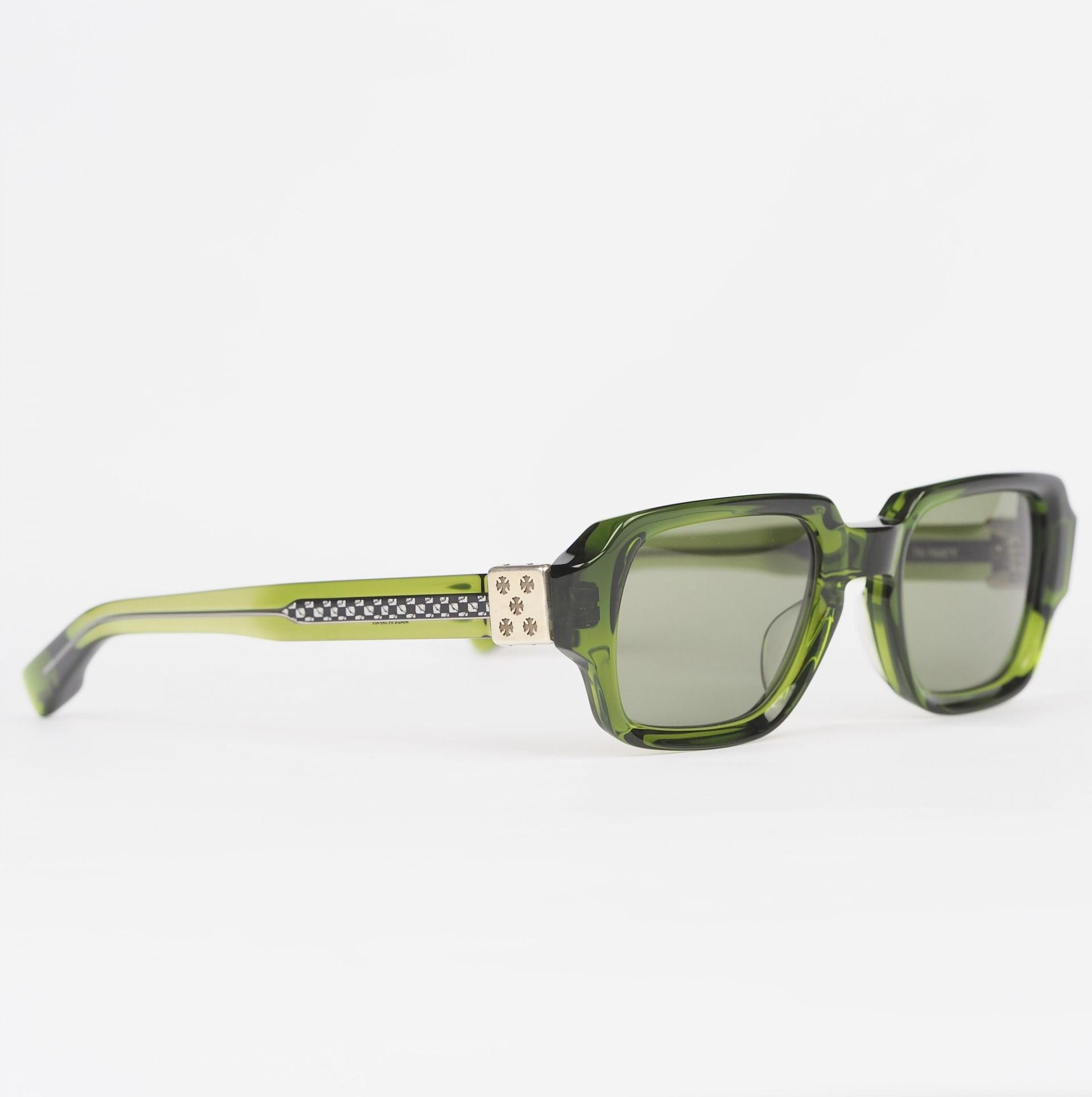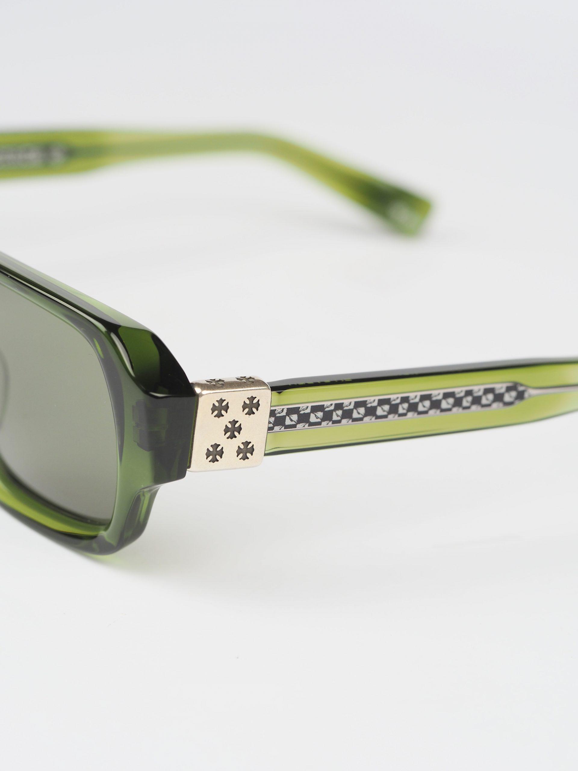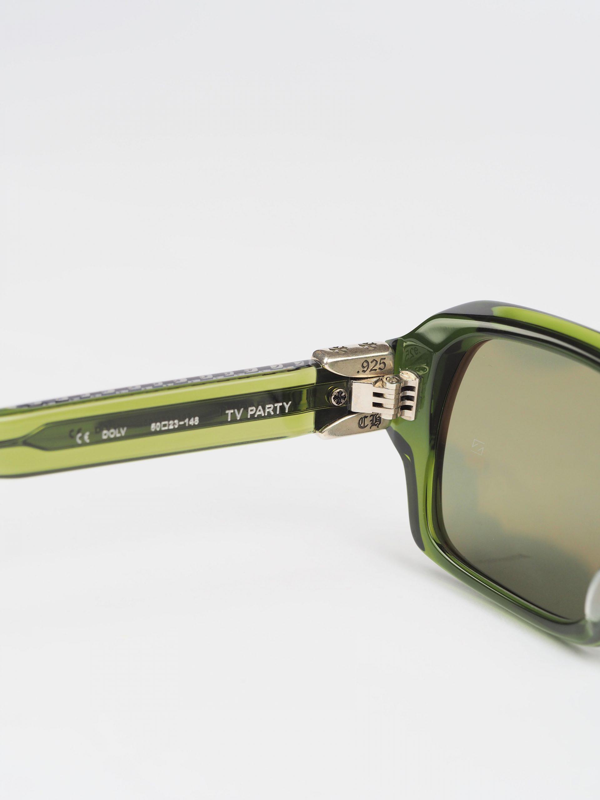 The Chrome Hearts Glasses TV PARTY in Dark Olive/Silver exude sophistication with a hint of edge. The dark olive frame paired with silver accents creates a striking contrast, making them a versatile and stylish accessory for any occasion.