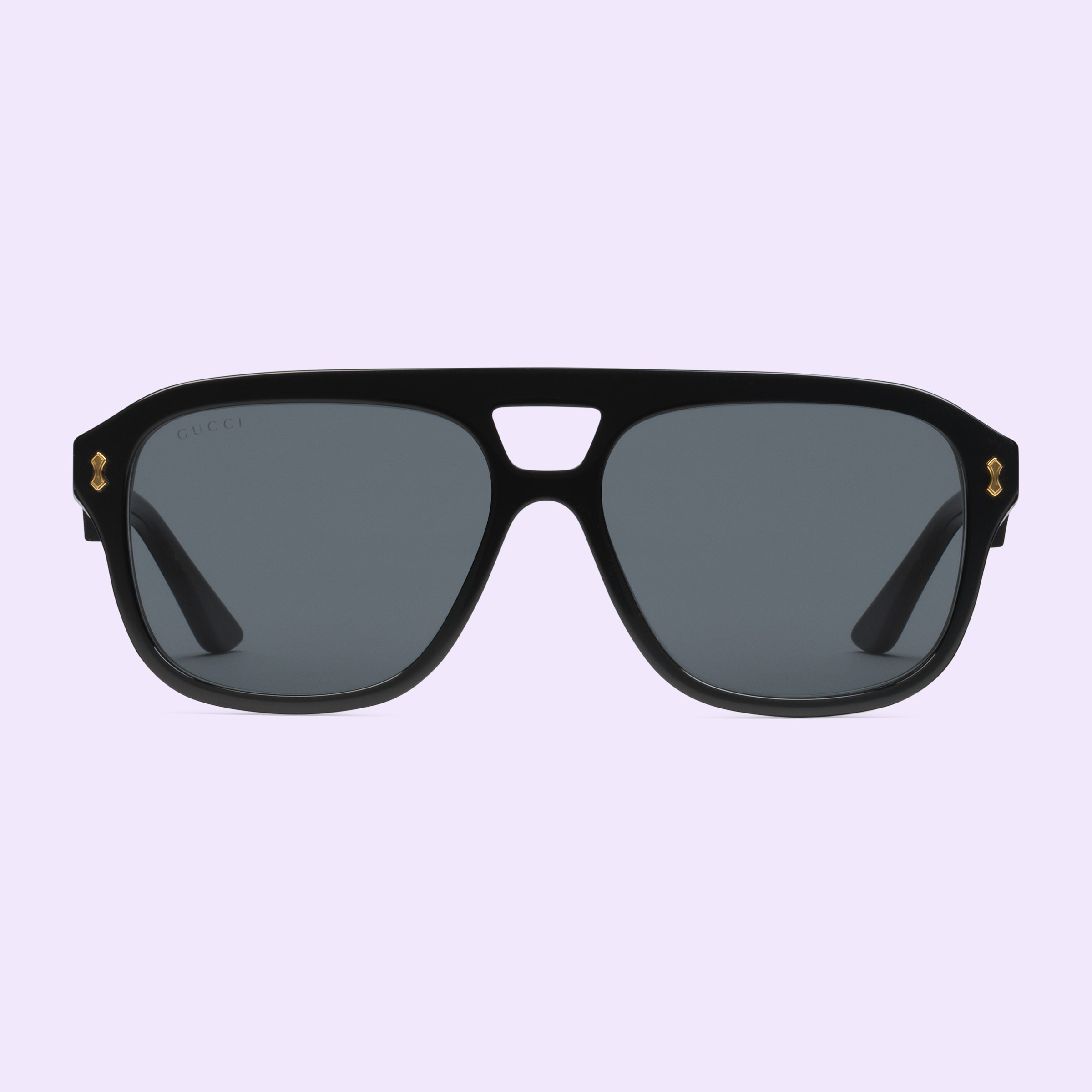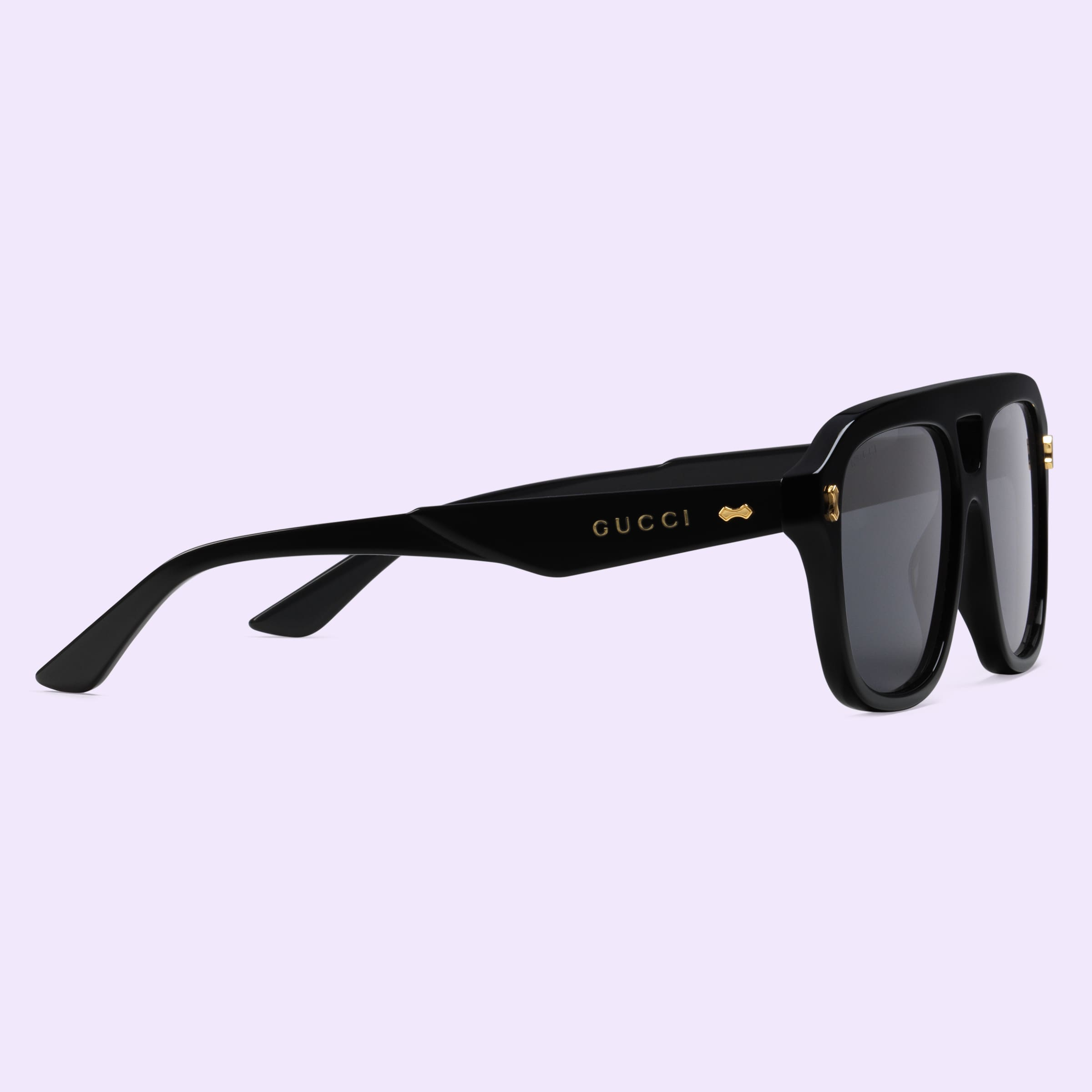 - Shiny black acetate temples with metal rivets and Gucci logo