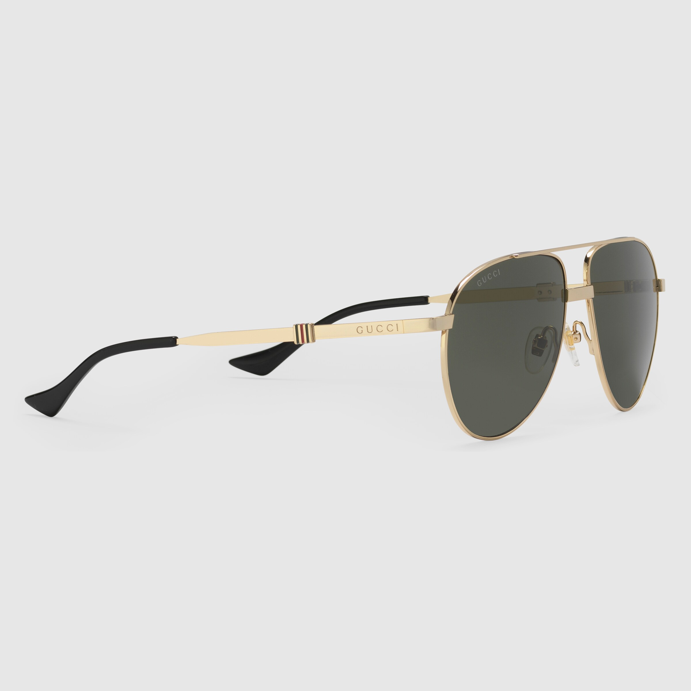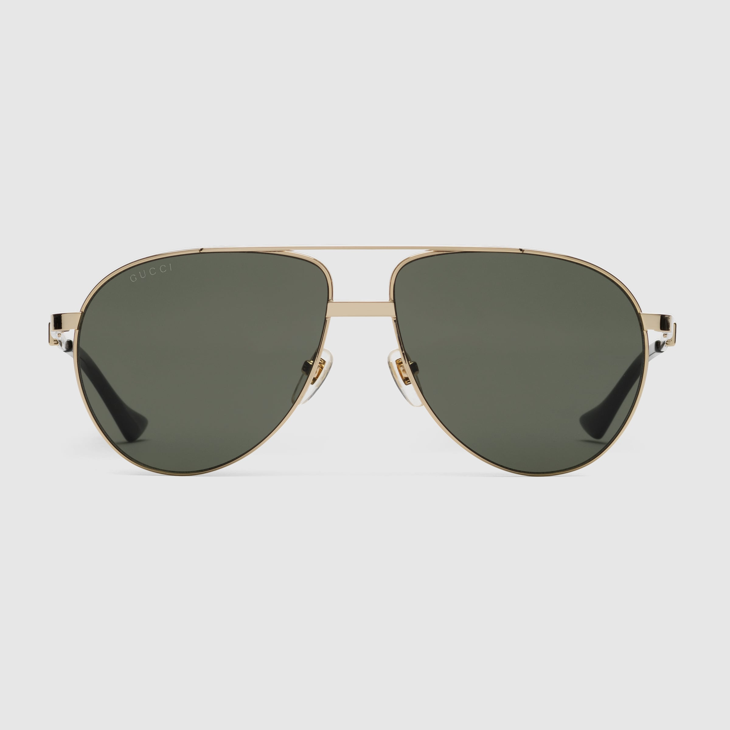 - Shiny gold-toned metal temples with engraved Gucci lettering, enamel Web and black acetate tips