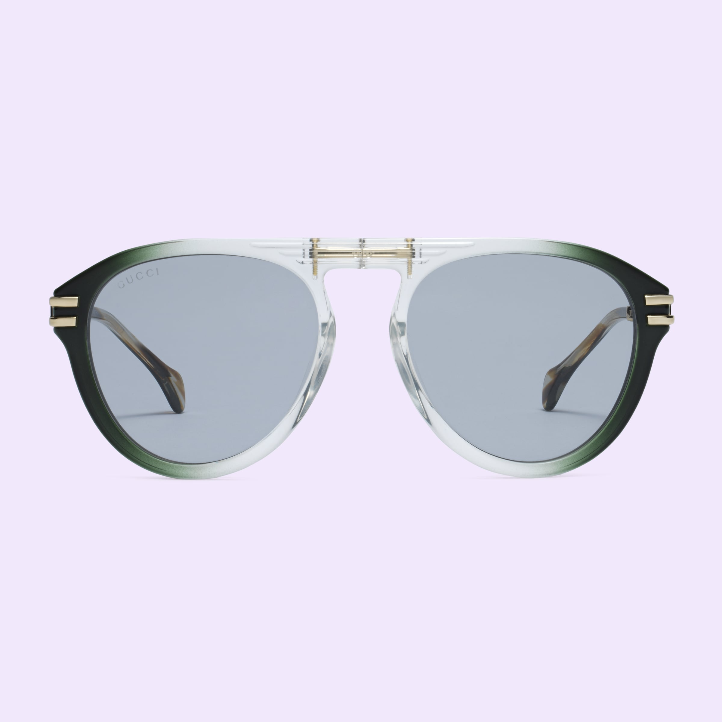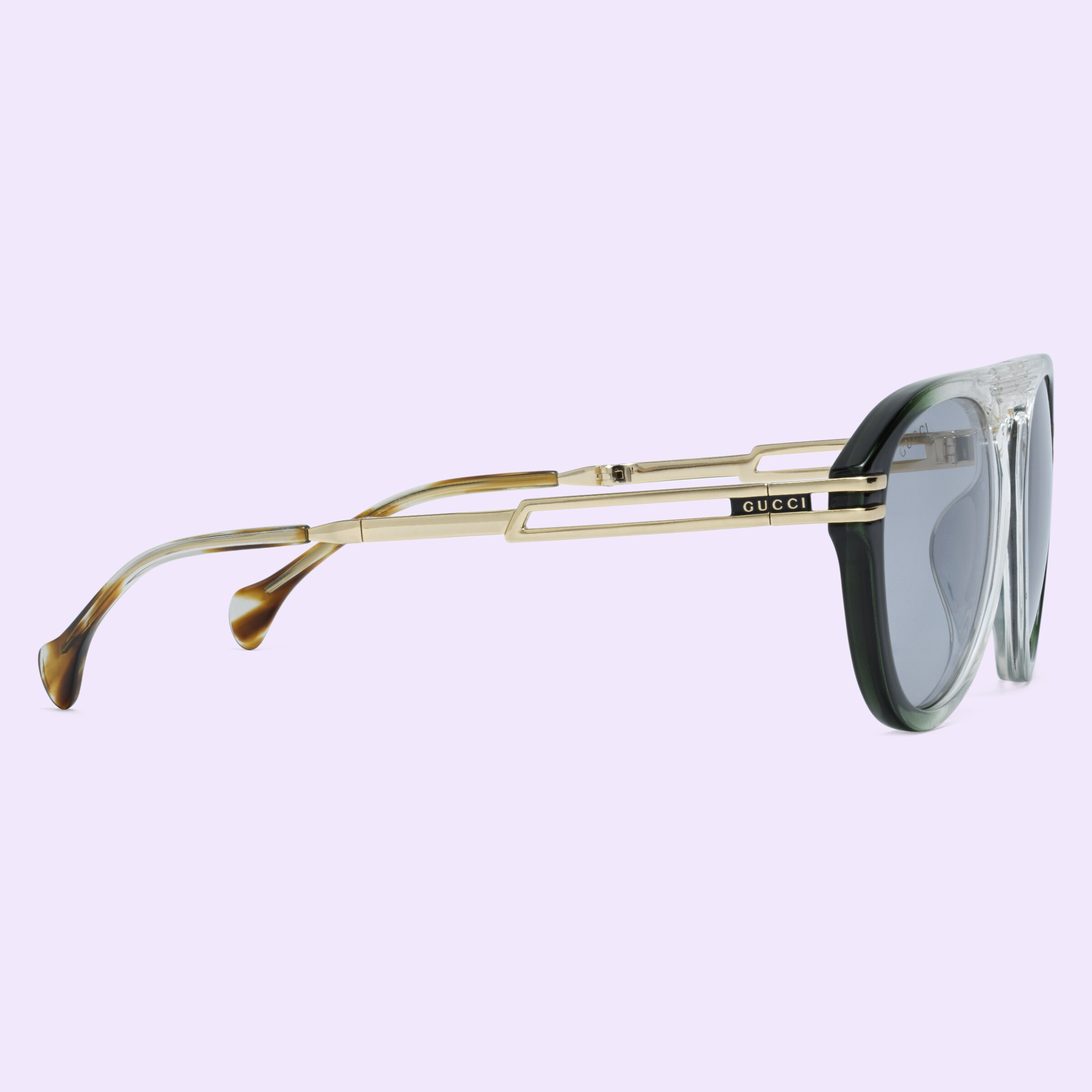 - Yellow-gold toned metal temples with acetate tips and Gucci logo