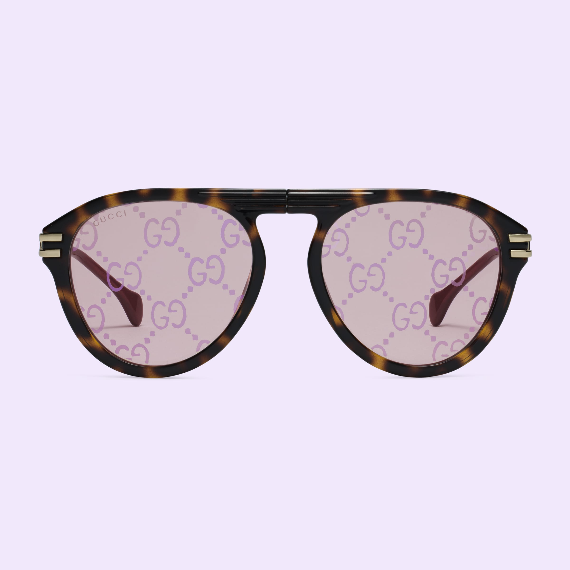 - Shiny yellow gold-toned metal temples with acetate tips and Gucci logo