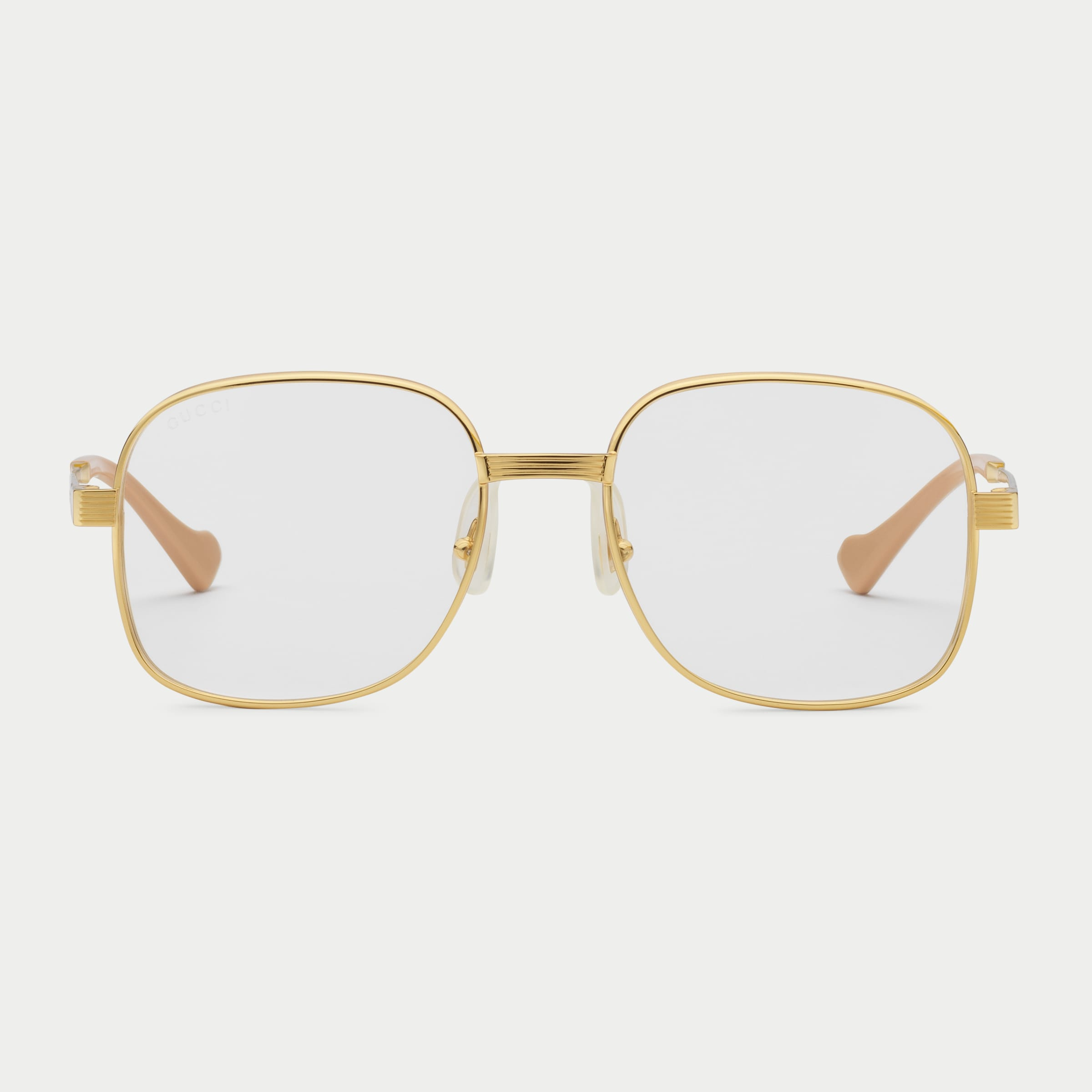 - Textured gold-toned metal temples with Gucci script and beige acetate tips