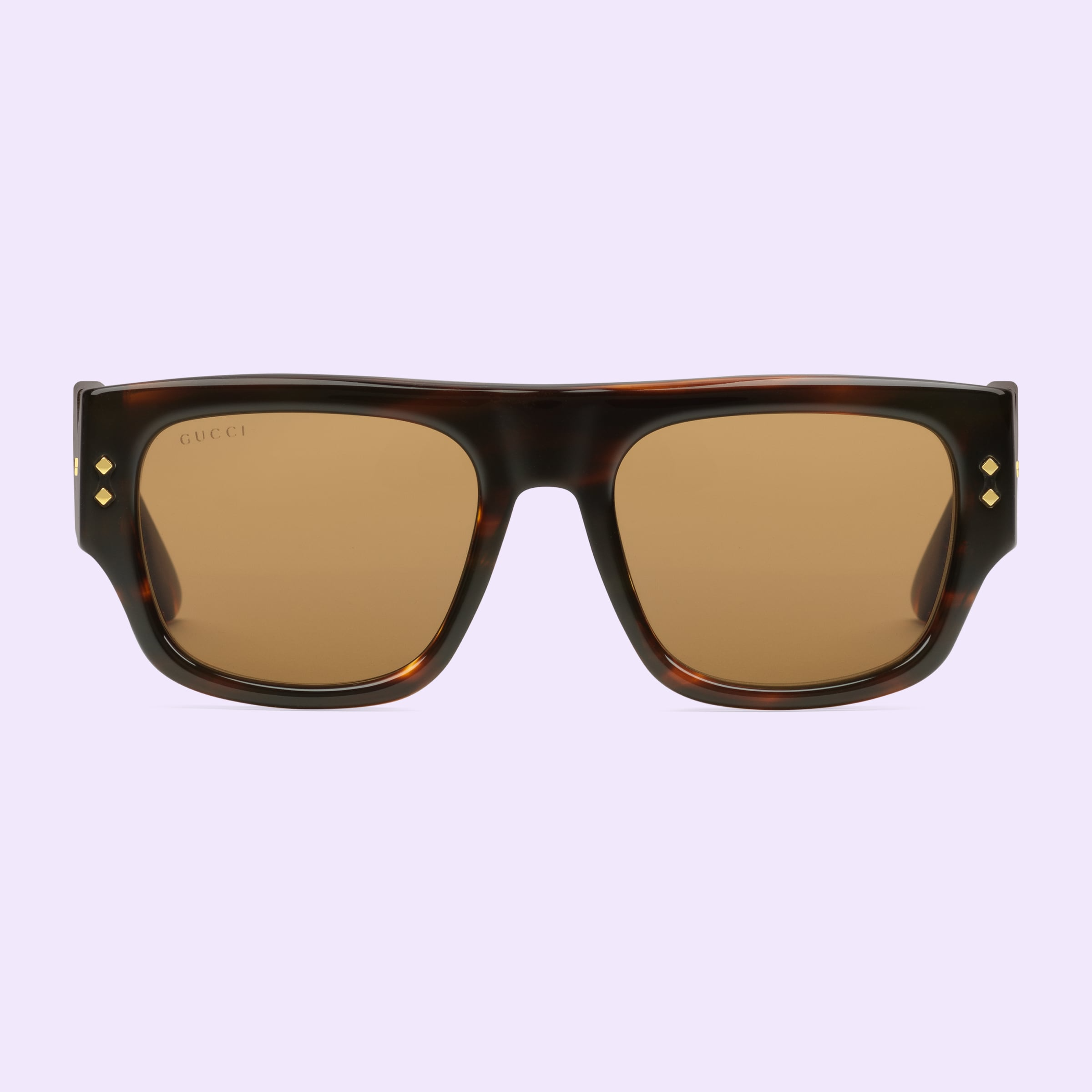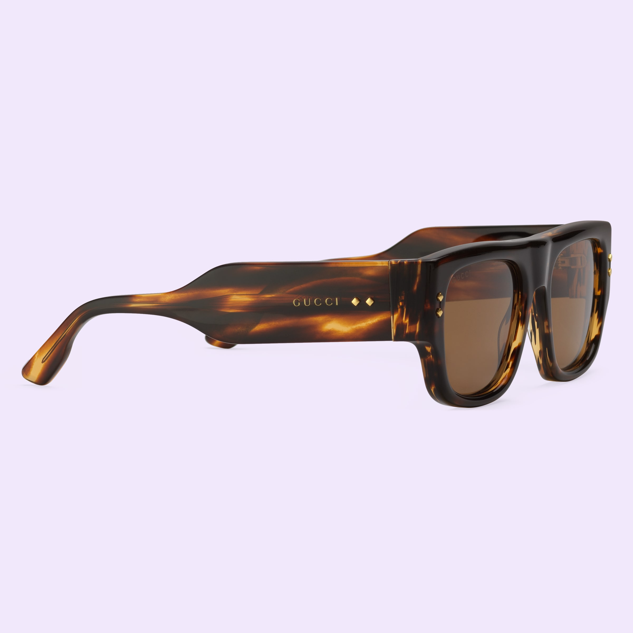 - Shiny dark brown temples with metal rivets and Gucci logo detail