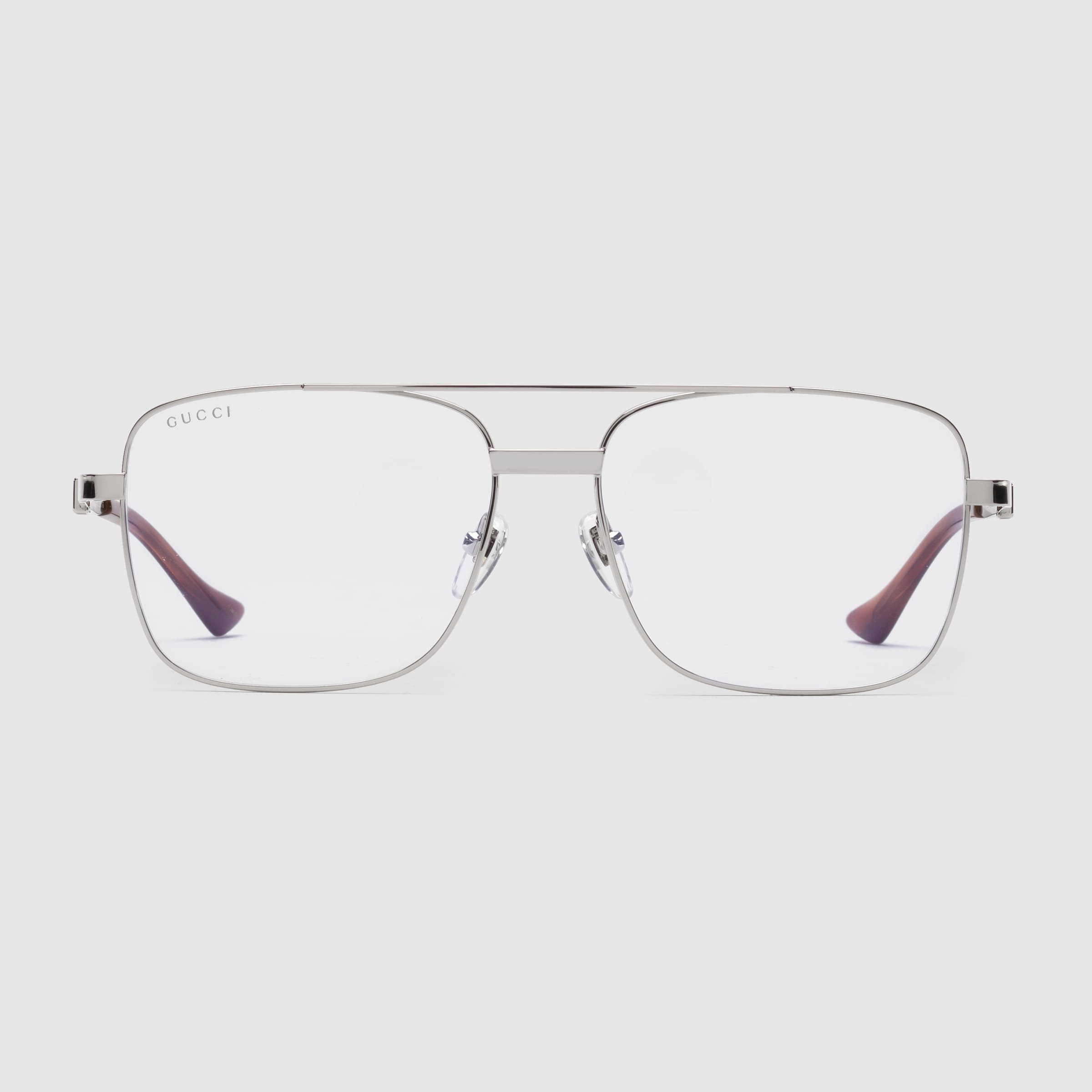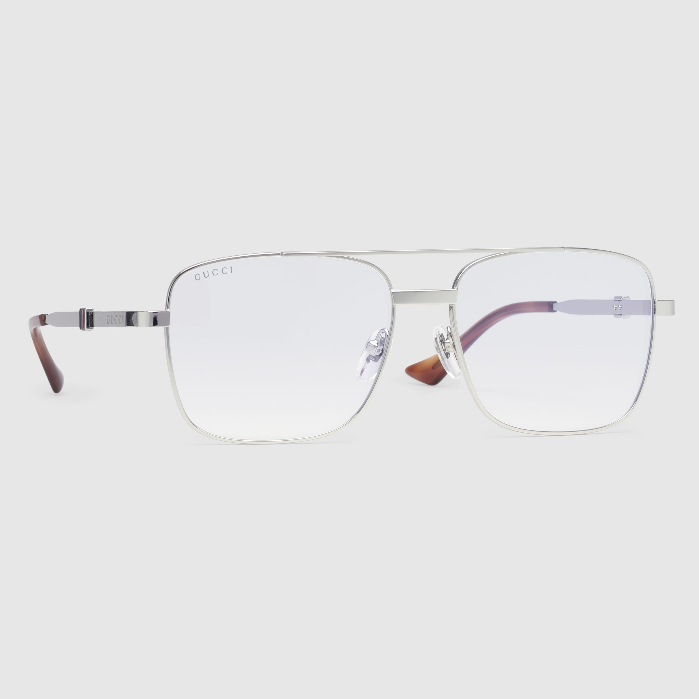 - Shiny silver-toned metal temples with engraved Gucci lettering, enamel Web and light tortoiseshell acetate tips