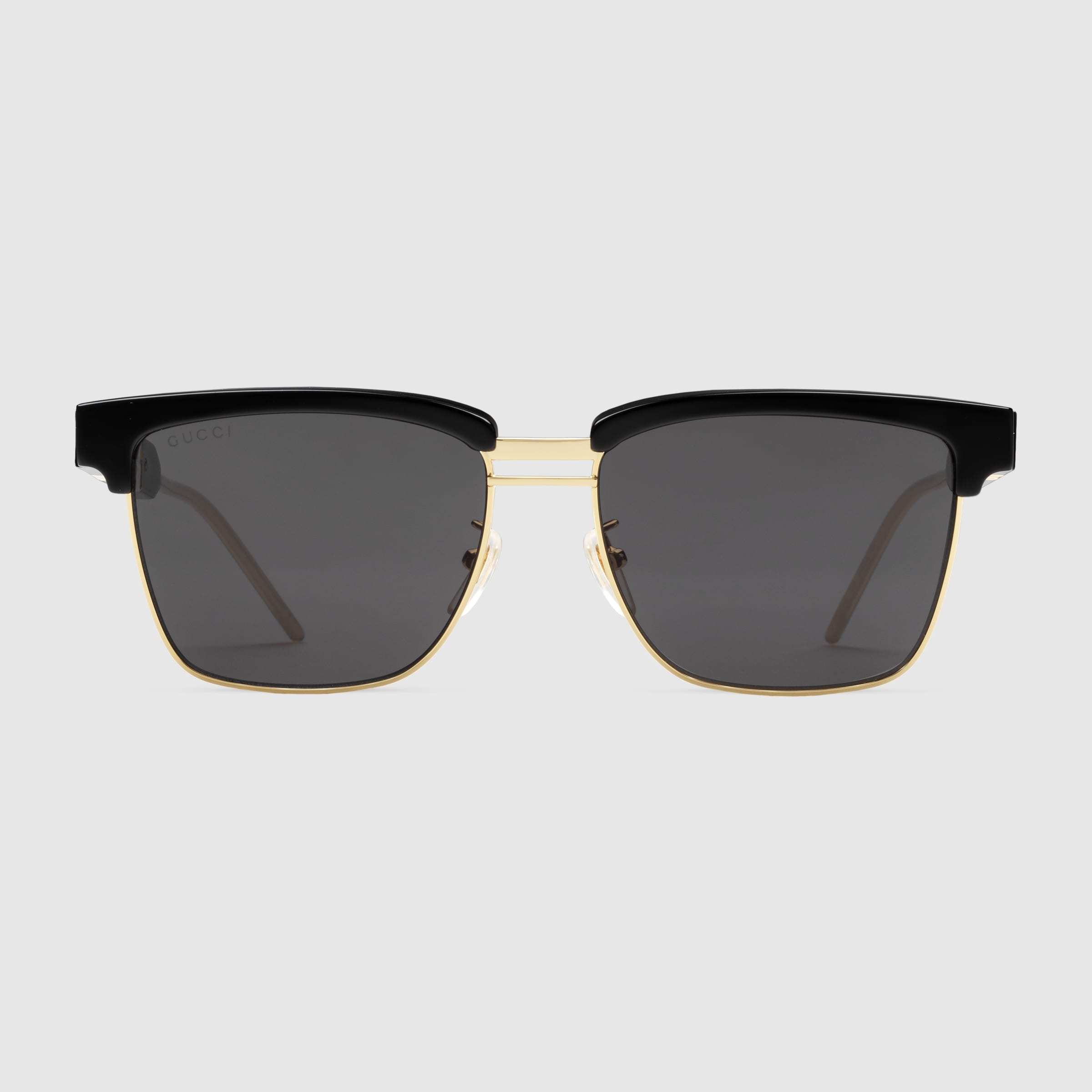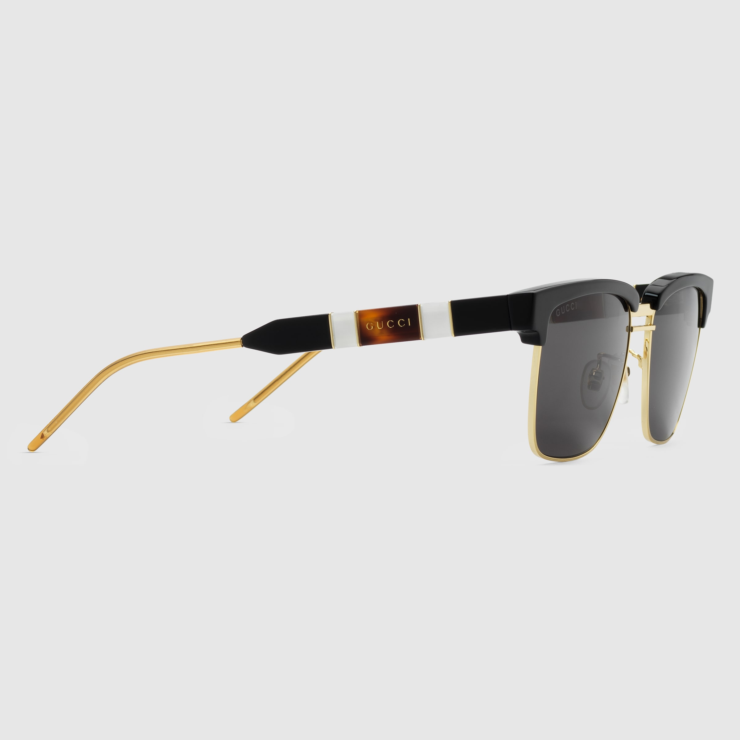 - Shiny black acetate temples with gold metal details, and tortoiseshell and mother of pearl effect acetate Web with Gucci script; soft amber acetate coated gold metal tips