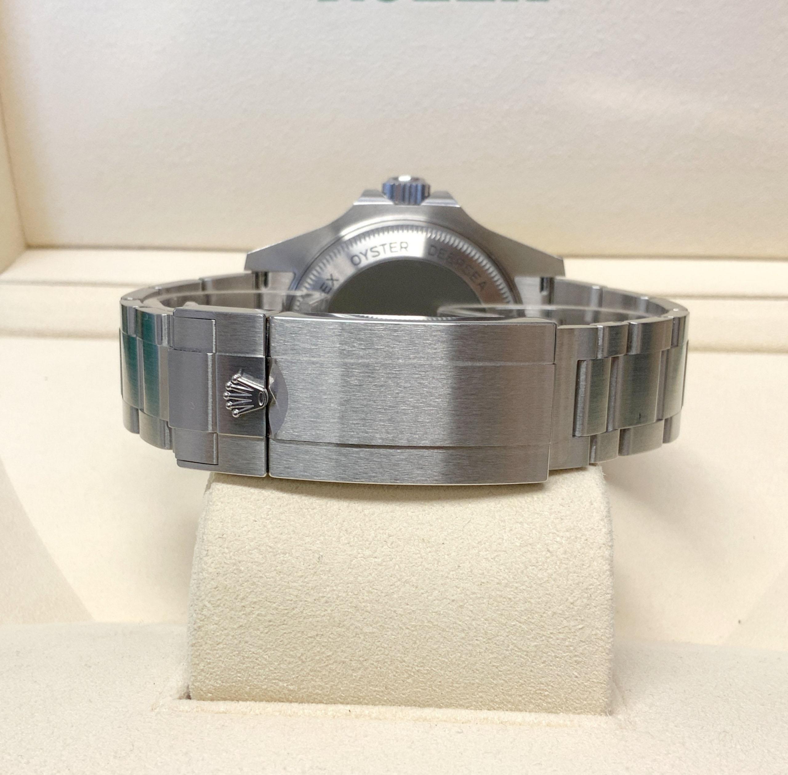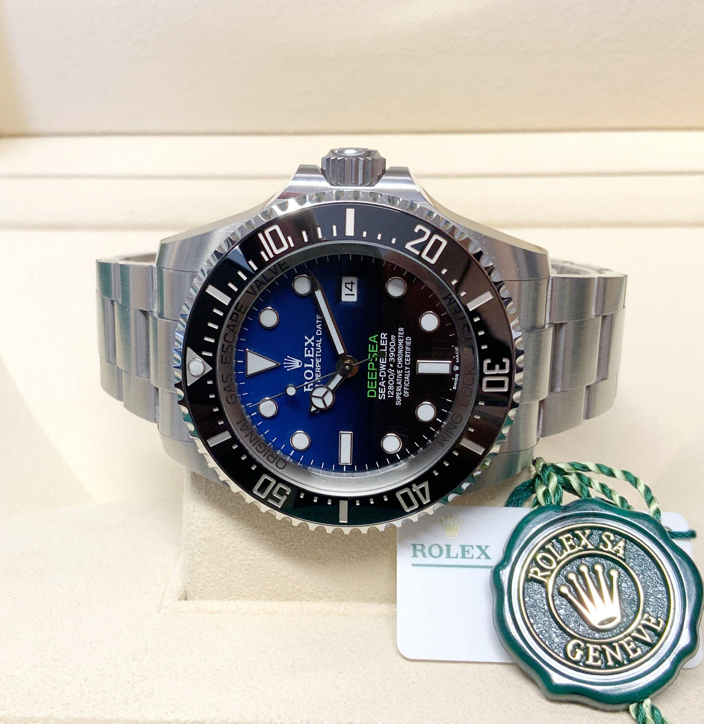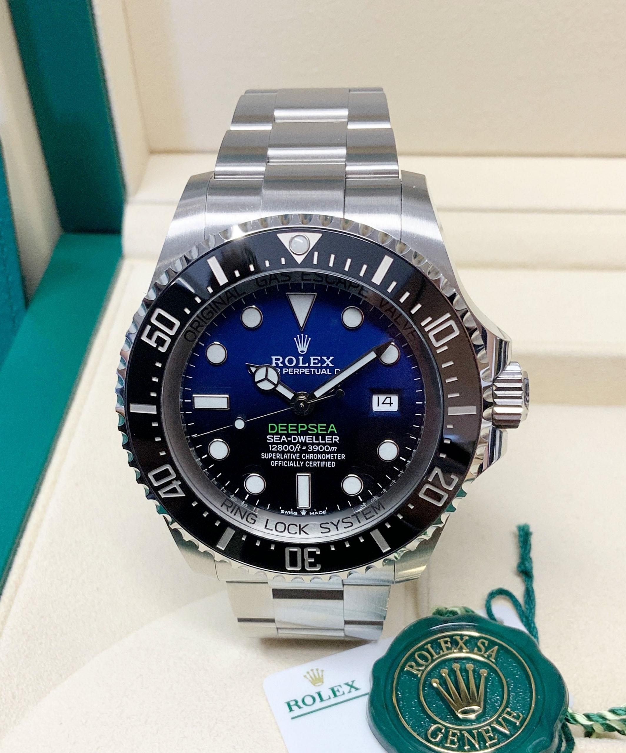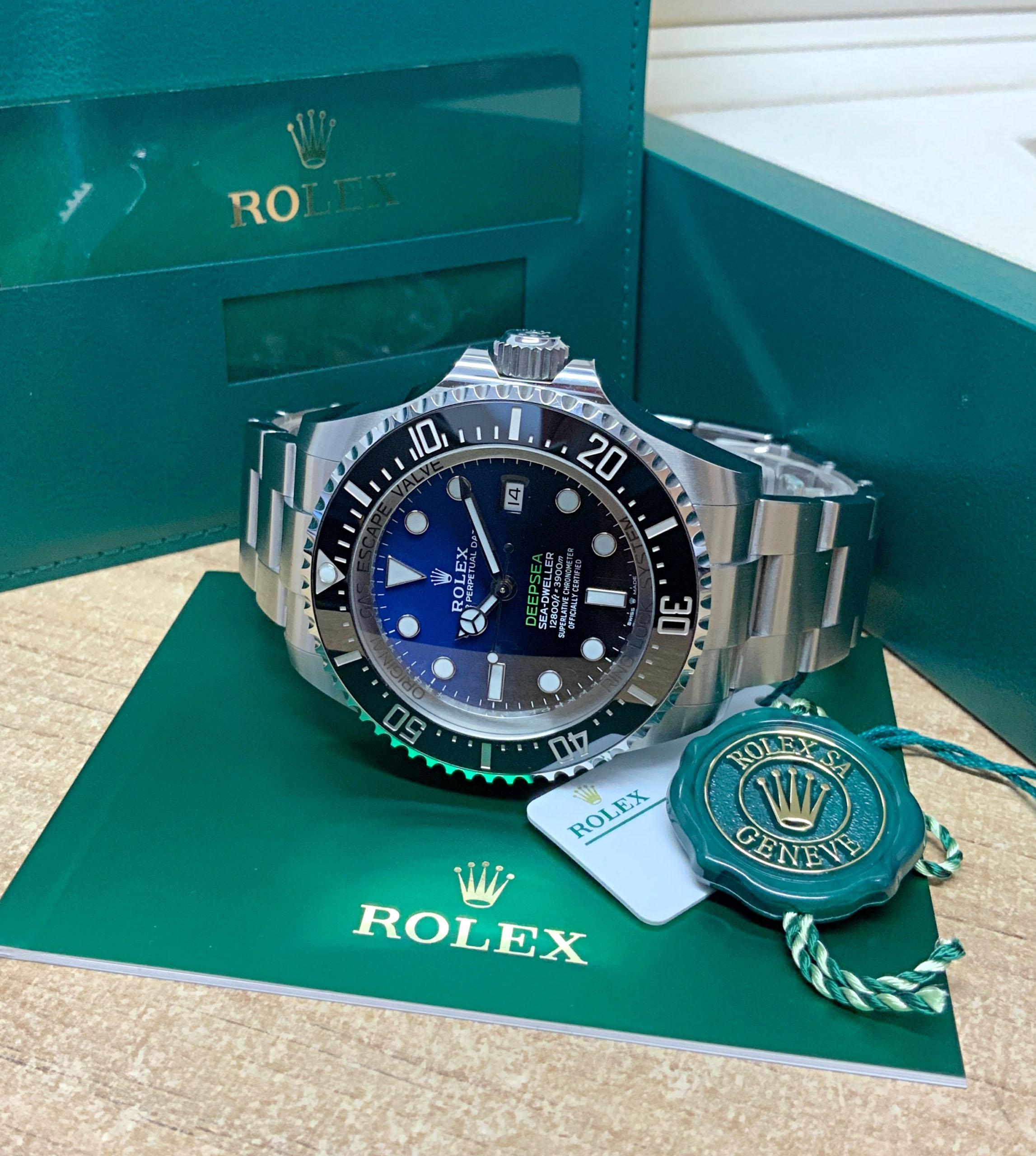 The Rolex Deepsea Sea-Dweller 126660 D-Blue is an exceptional timepiece with a 44mm case. Its unique D-Blue dial, transitioning from deep blue to black, represents the depths of the ocean. Designed for extreme diving, it features a helium escape valve and water resistance up to 12,800 feet. The luminescent hour markers and hands ensure excellent legibility in low-light conditions. Powered by an automatic movement and protected by a scratch-resistant sapphire crystal, the Rolex Deepsea Sea-Dweller 126660 D-Blue is a robust and reliable companion for underwater exploration. Its striking design and exceptional performance make it a sought-after watch for adventure seekers.