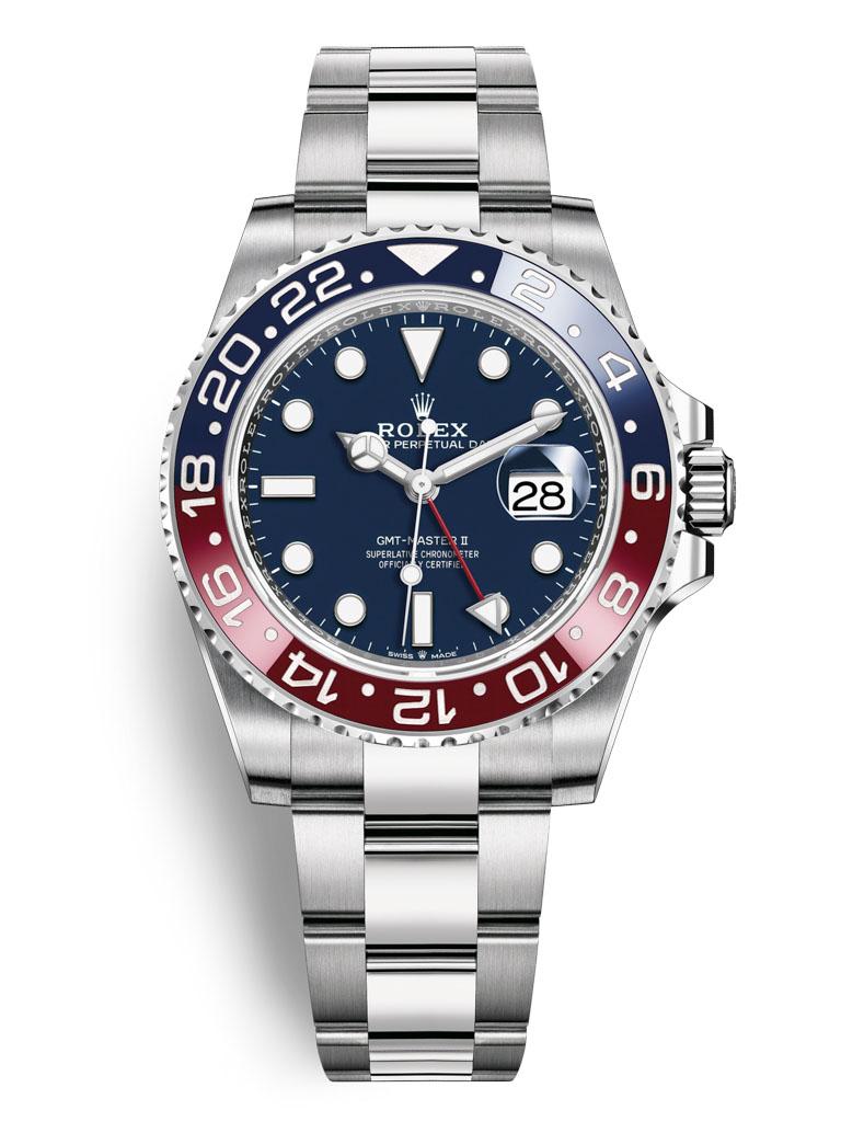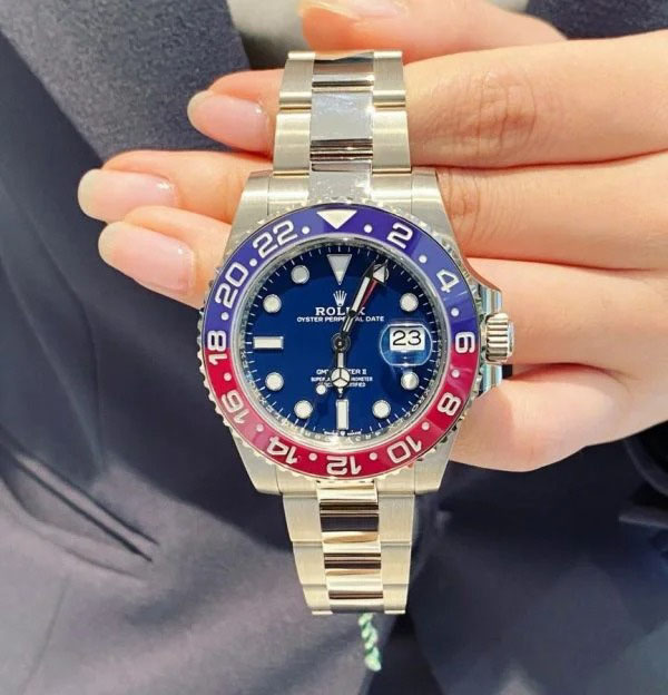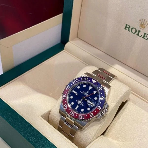 The Rolex Oyster GMT-Master II 126719BLRO-0003 is an exquisite timepiece with a 40mm case. Its striking blue and red ceramic bezel, known as the "Pepsi" color scheme, adds a vibrant touch. Crafted from white gold, this watch exudes luxury and sophistication. The black dial features luminous hour markers and hands, ensuring exceptional legibility. Powered by an automatic movement and protected by a scratch-resistant sapphire crystal, the Rolex GMT-Master II 126719BLRO-0003 is a prestigious and reliable choice for world travelers and watch enthusiasts.