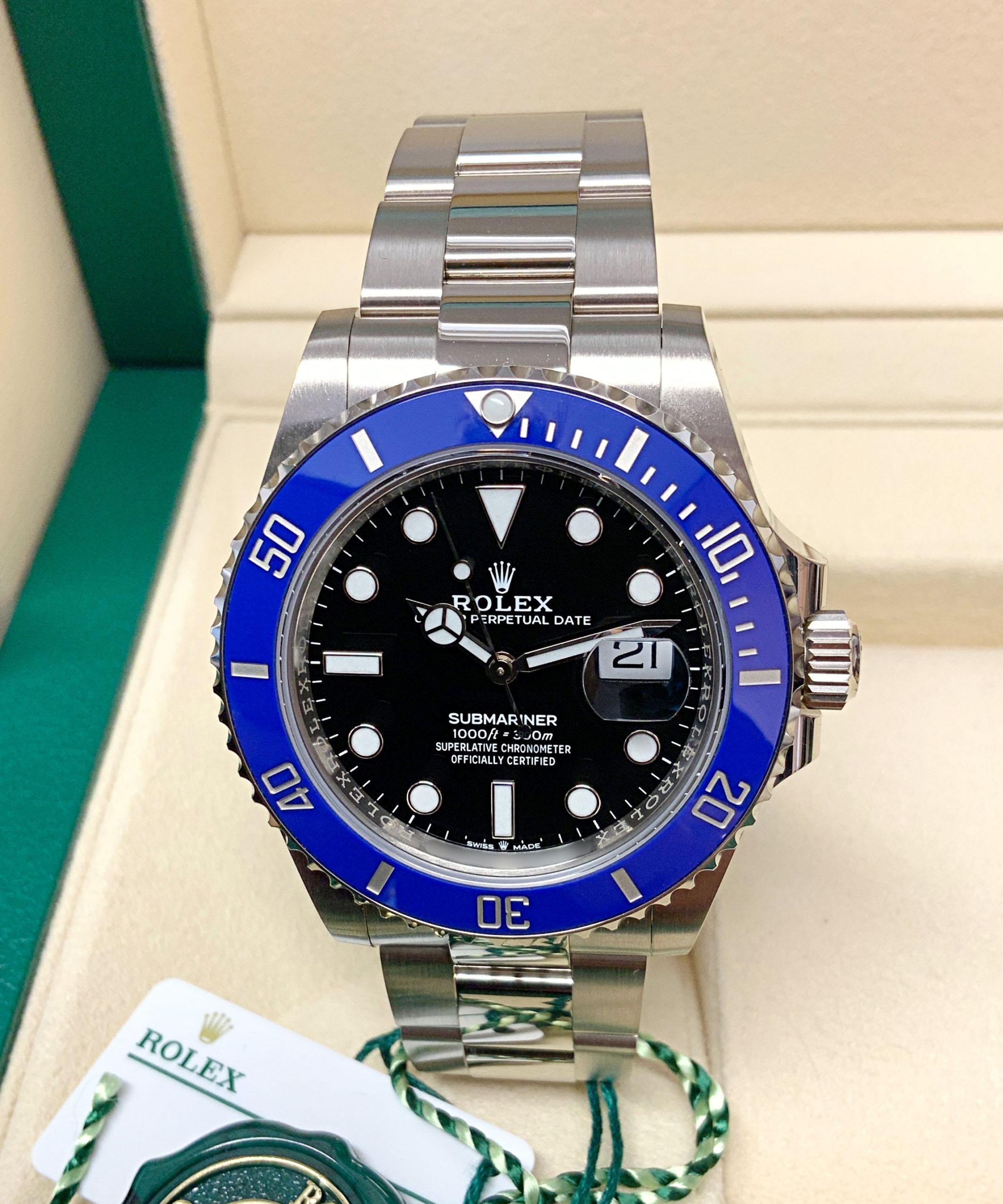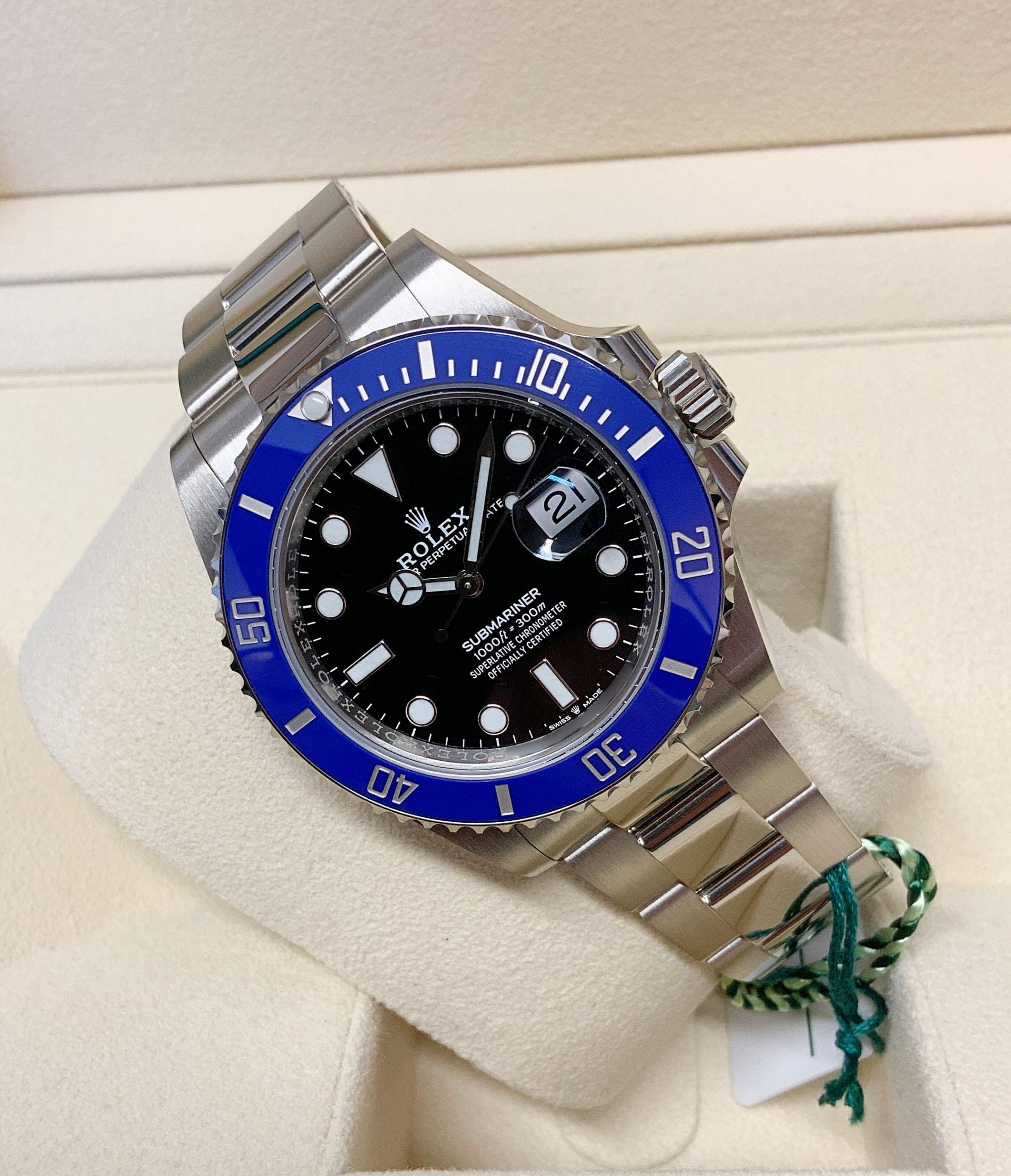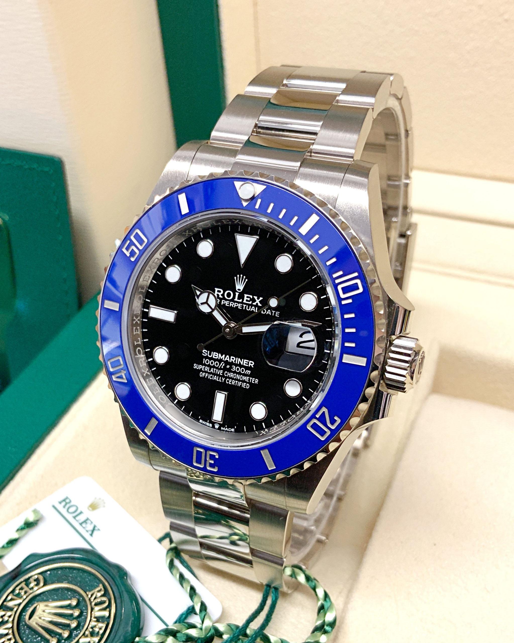 The Rolex Submariner Date 126619LB in white gold is a striking 40mm timepiece. Crafted with precision, its white gold case exudes elegance and sophistication. The blue ceramic bezel with white gold numerals adds a pop of color. Powered by a self-winding movement, it guarantees accurate timekeeping. The luminescent markers and hands ensure readability even in low-light conditions. With its water resistance and iconic design, this Rolex Submariner Date is a timeless symbol of style and functionality.