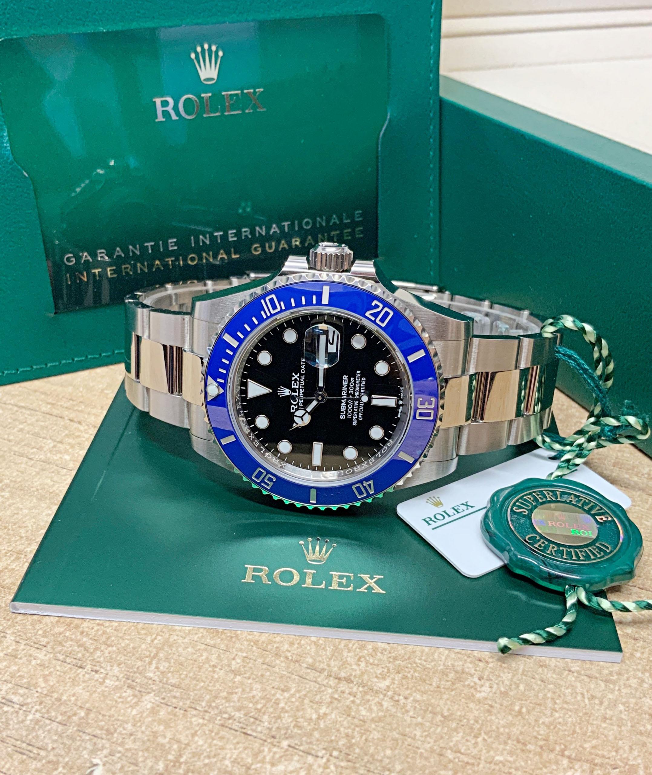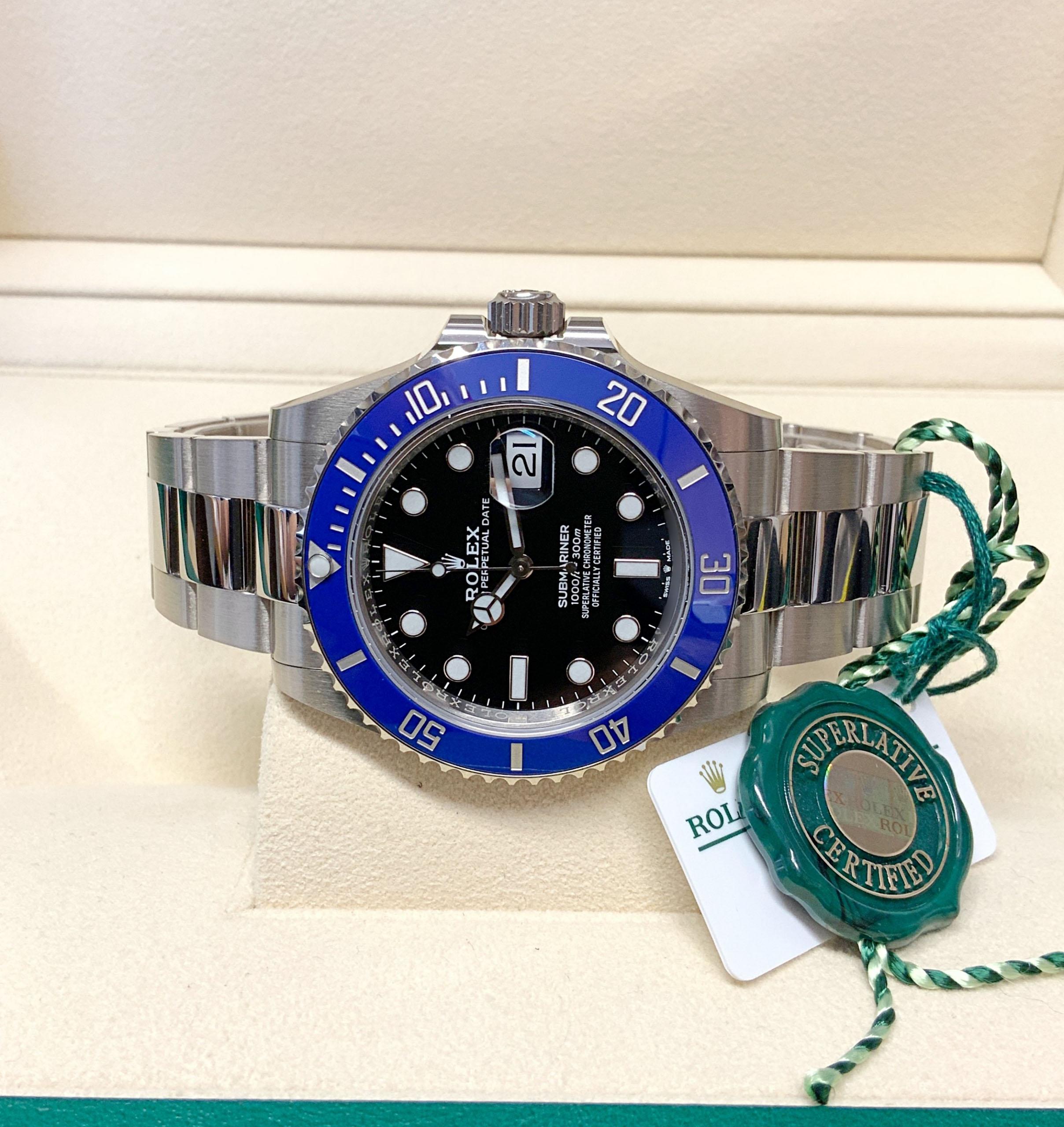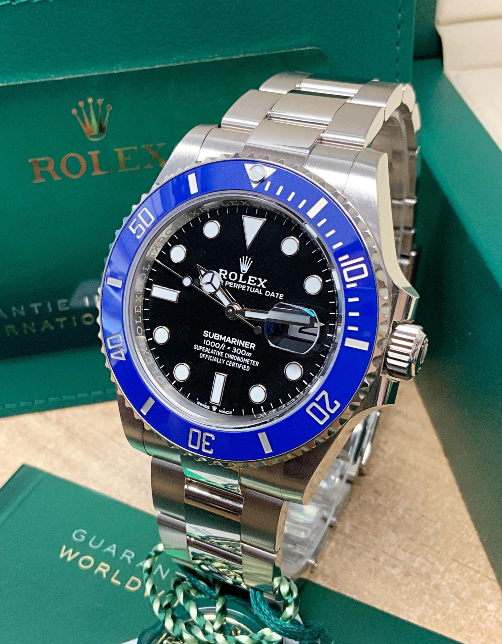 The Rolex Submariner Date 126619LB in white gold is a striking 40mm timepiece. Crafted with precision, its white gold case exudes elegance and sophistication. The blue ceramic bezel with white gold numerals adds a pop of color. Powered by a self-winding movement, it guarantees accurate timekeeping. The luminescent markers and hands ensure readability even in low-light conditions. With its water resistance and iconic design, this Rolex Submariner Date is a timeless symbol of style and functionality.