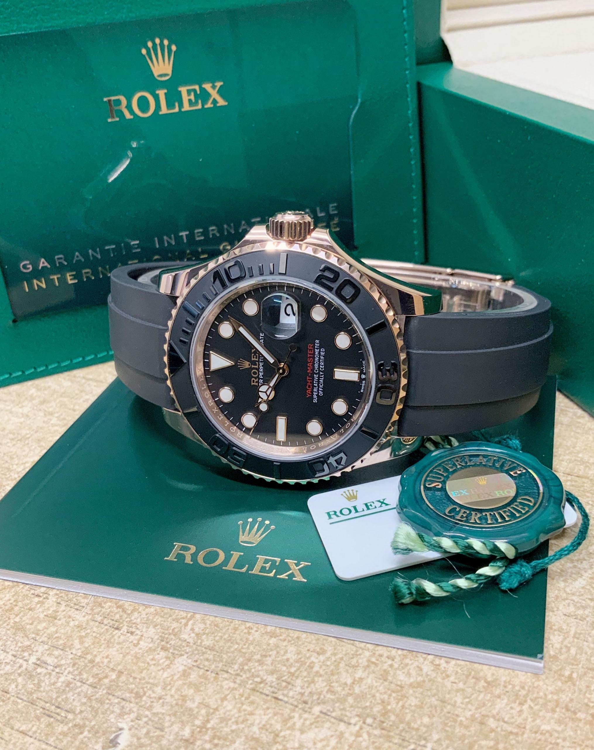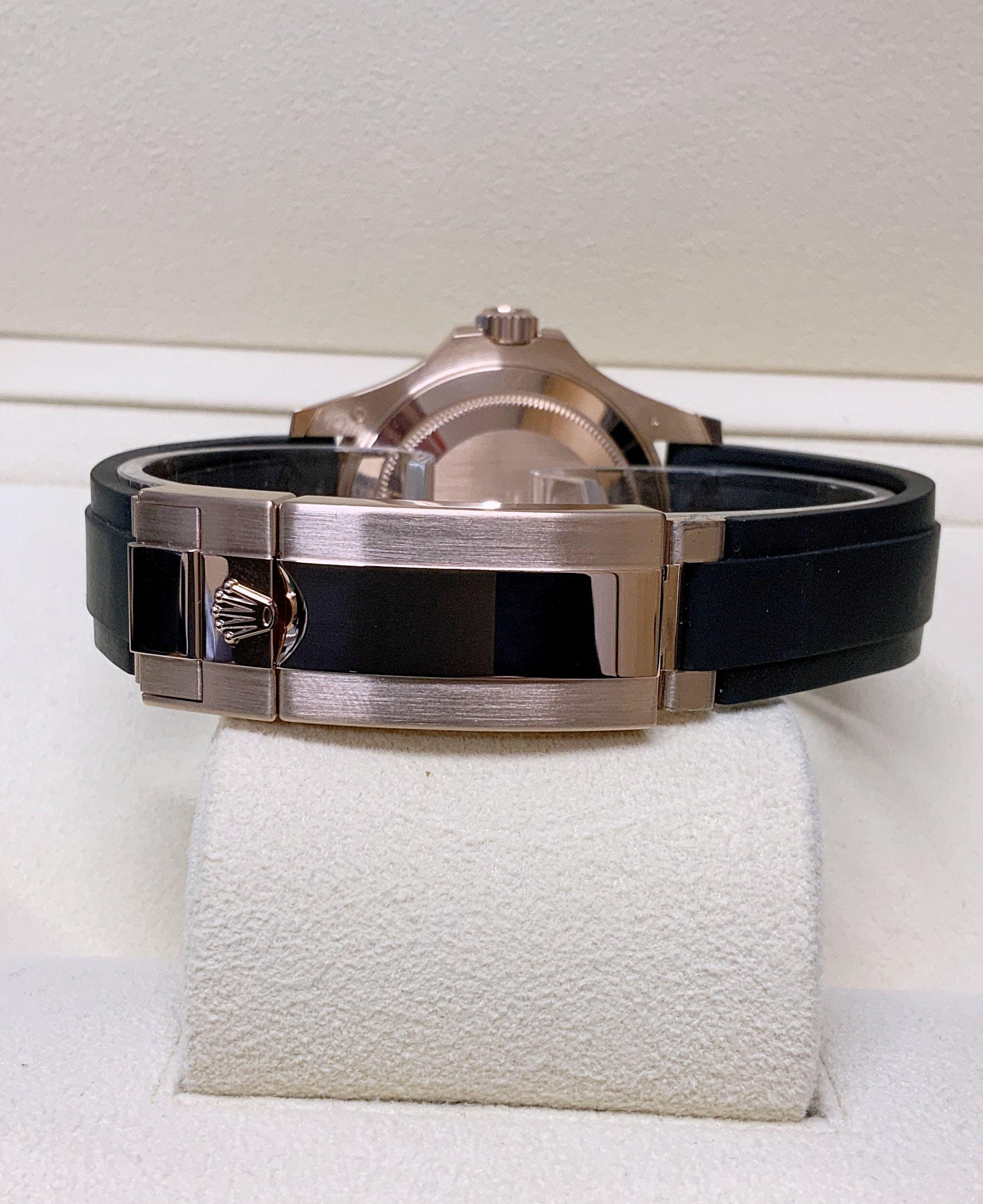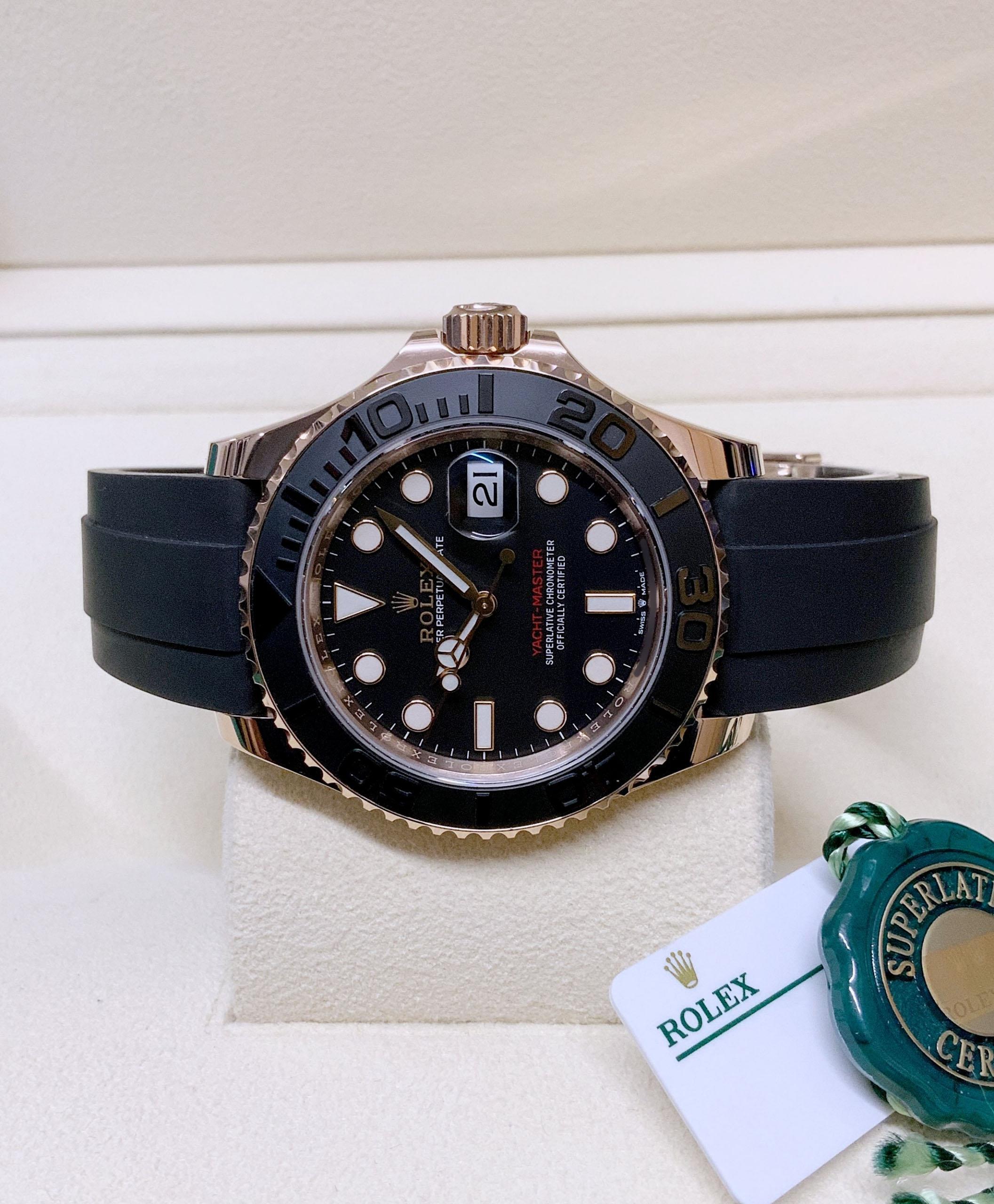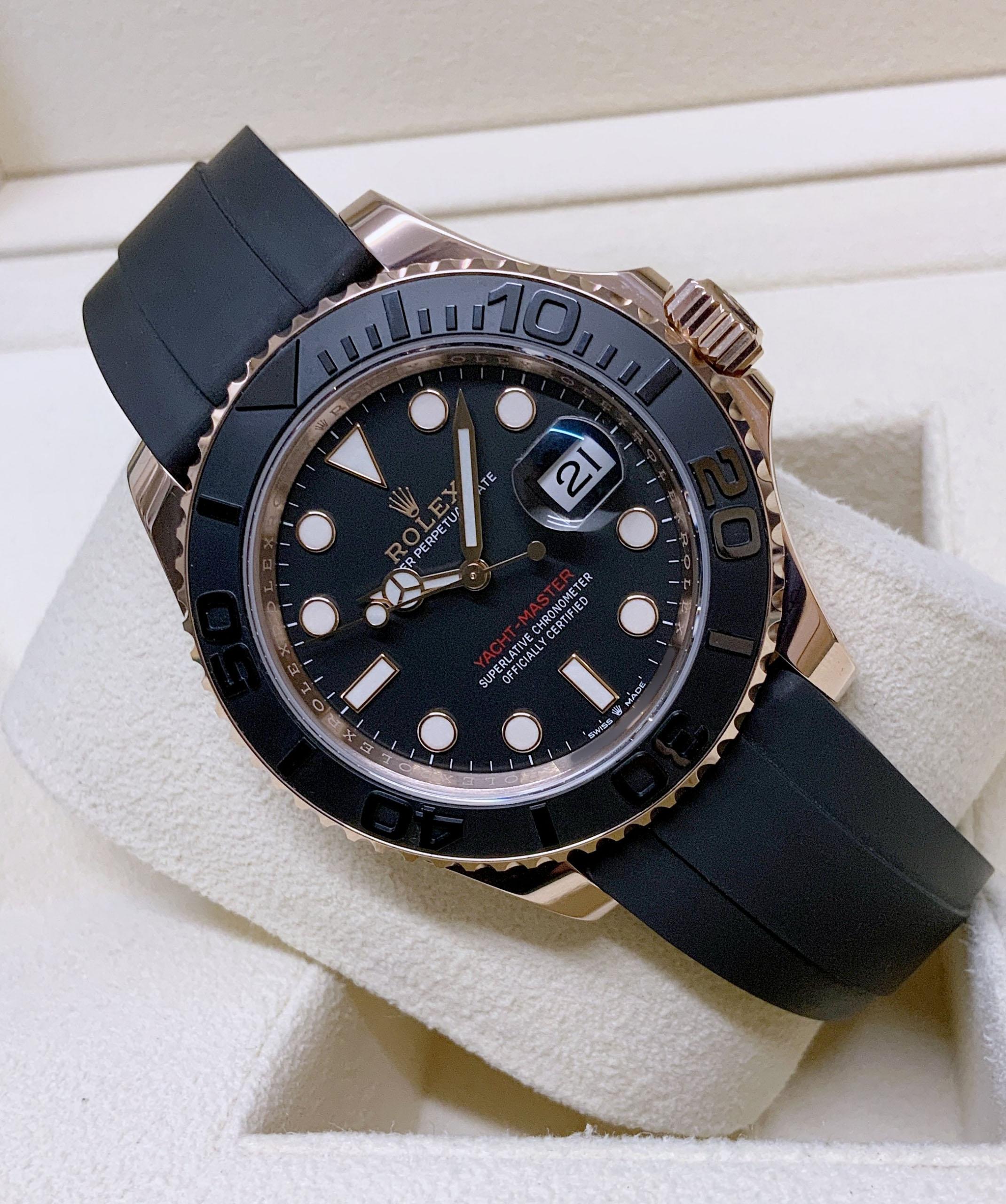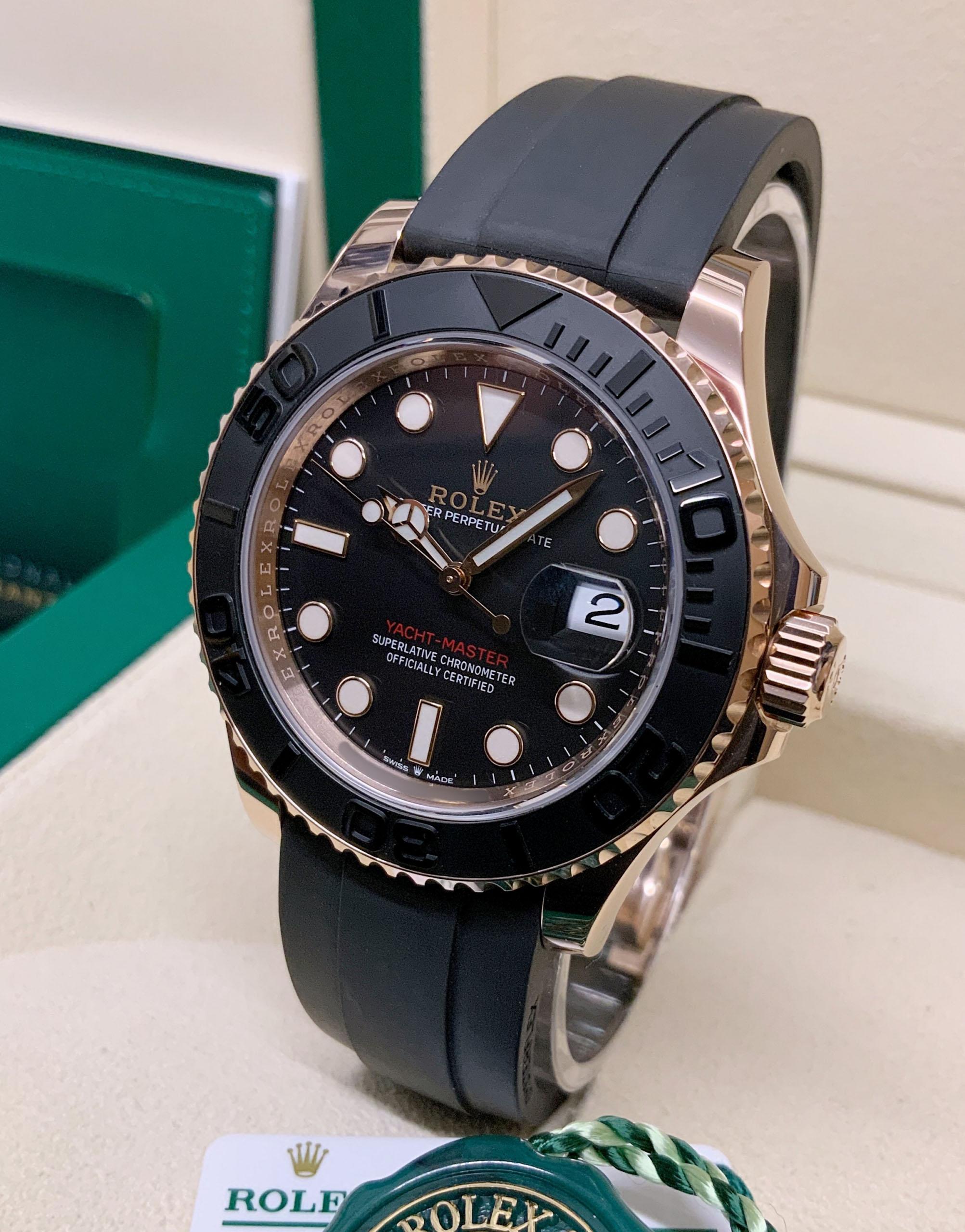 The Rolex Yacht-Master 126655 in 40mm rose gold is a luxurious timepiece. Its exquisite design showcases the perfect blend of elegance and sportiness. The black ceramic bezel with raised numerals adds a touch of sophistication. Powered by a self-winding movement, it ensures accurate timekeeping. The Oysterflex bracelet combines the comfort of a rubber strap with the durability of a metal bracelet. With its captivating rose gold case and impeccable craftsmanship, this Rolex Yacht-Master is a symbol of prestige and style.