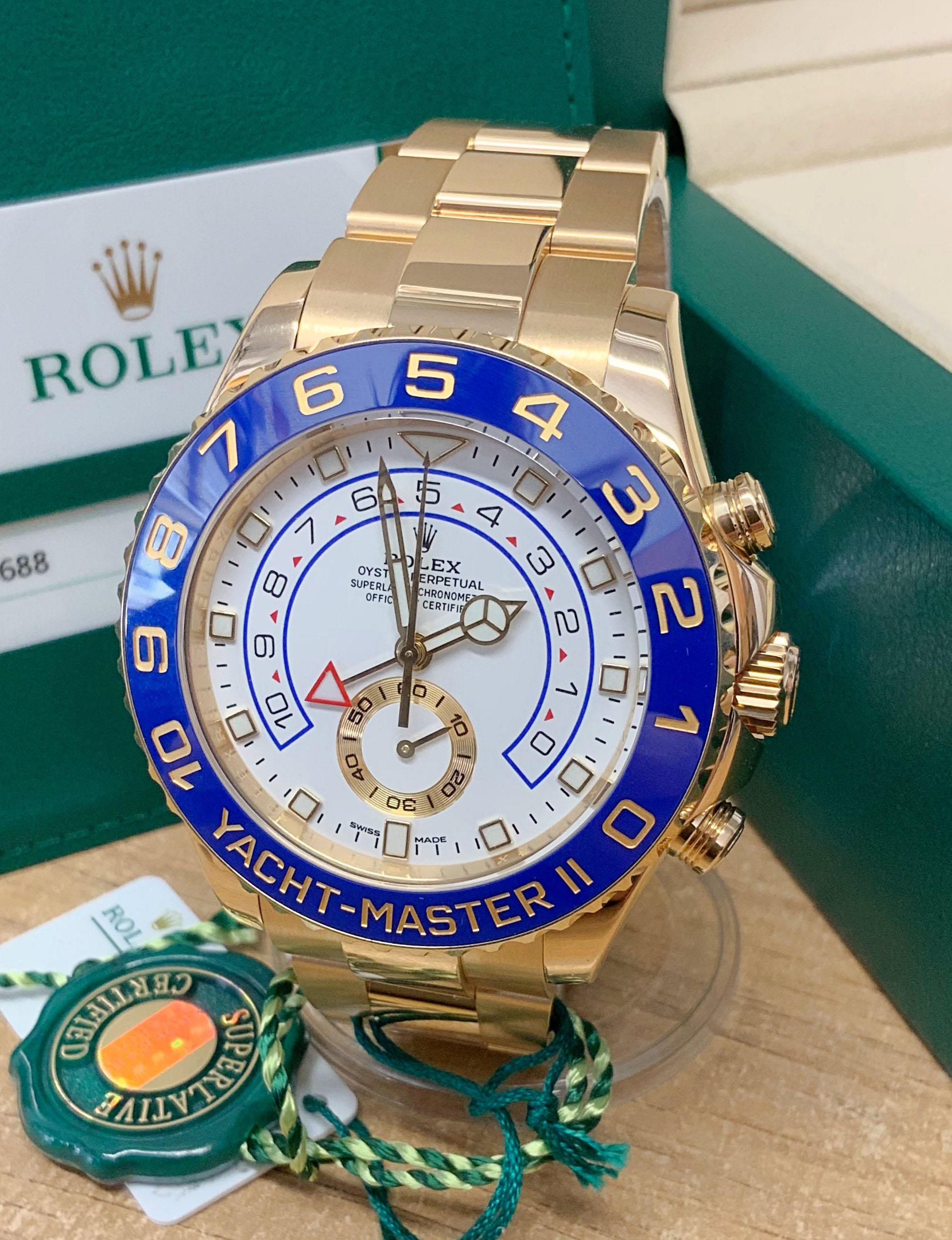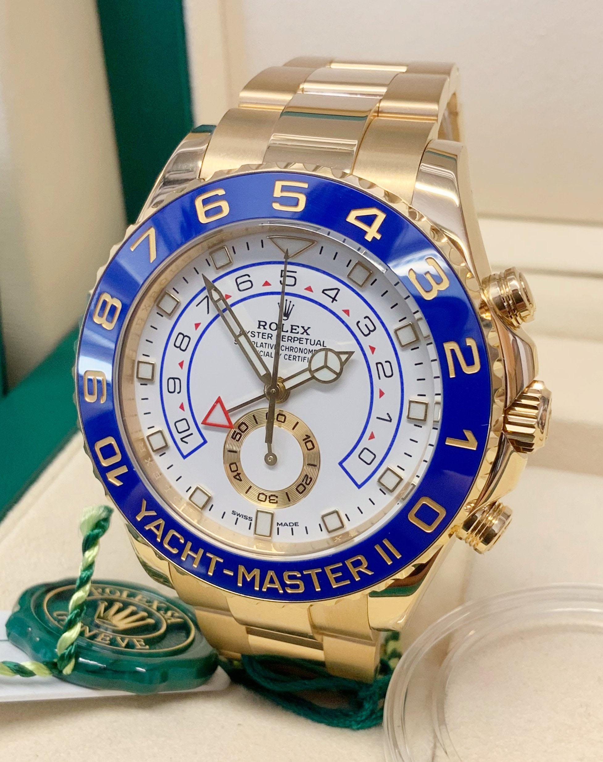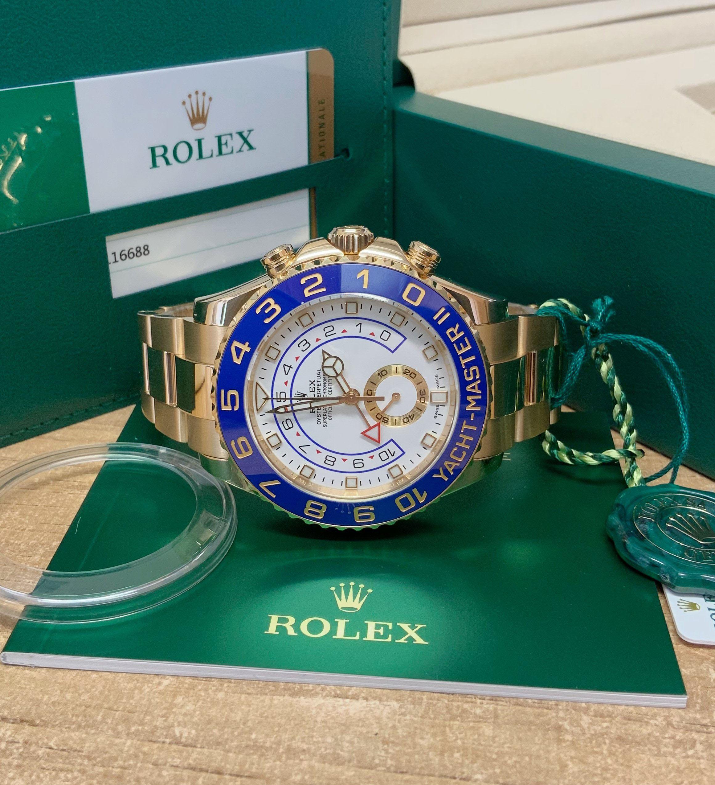 The Rolex Yacht-Master II 116688 is a striking 44mm yellow gold timepiece. Its bold and luxurious design commands attention. The blue ceramic bezel with gold numerals adds a touch of elegance. Equipped with a regatta timer and a programmable countdown, it's the ultimate watch for yachting enthusiasts. Powered by a self-winding movement, it offers precise timekeeping. With its exquisite craftsmanship and attention to detail, this Rolex Yacht-Master II represents the pinnacle of style and performance.